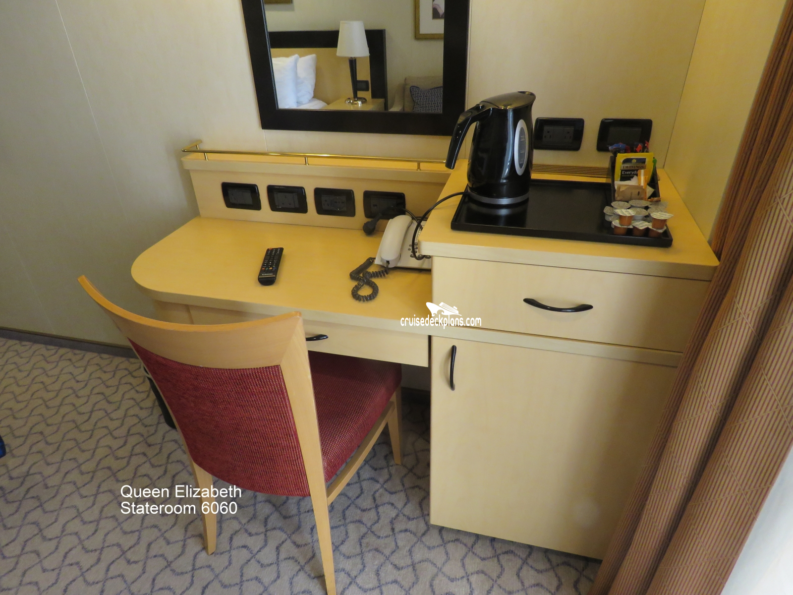 These are some actual stateroom pictures of cabin 6060 on the Queen Elizabeth. Click on images below for larger image and slide show. The slide show will show the date the picture was uploaded to out website. This date is useful because Queen Elizabeth typically will update its cabins every three to five years with new carpeting and decor. We will keep older pictures for you to compare the more recent photos to. The pictures are sorted by the newest ones first. Most of our cabin pictures are contributed by actual cruisers. We pay 50 cents for any that we use. You can upload your cabin photos HERE. Afer you are done looking at these photos and/or the videos below you can click here to select another cabin.