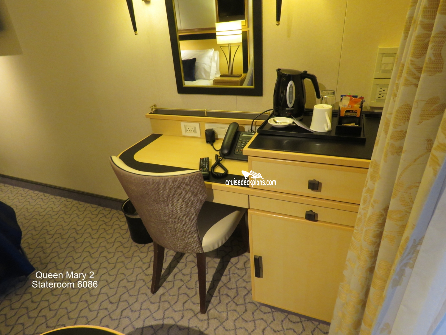 These are some actual stateroom pictures of cabin 6086 on the Queen Mary 2. Click on images below for larger image and slide show. The slide show will show the date the picture was uploaded to out website. This date is useful because Queen Mary 2 typically will update its cabins every three to five years with new carpeting and decor. We will keep older pictures for you to compare the more recent photos to. The pictures are sorted by the newest ones first. Most of our cabin pictures are contributed by actual cruisers. We pay 50 cents for any that we use. You can upload your cabin photos HERE. Afer you are done looking at these photos and/or the videos below you can click here to select another cabin.
