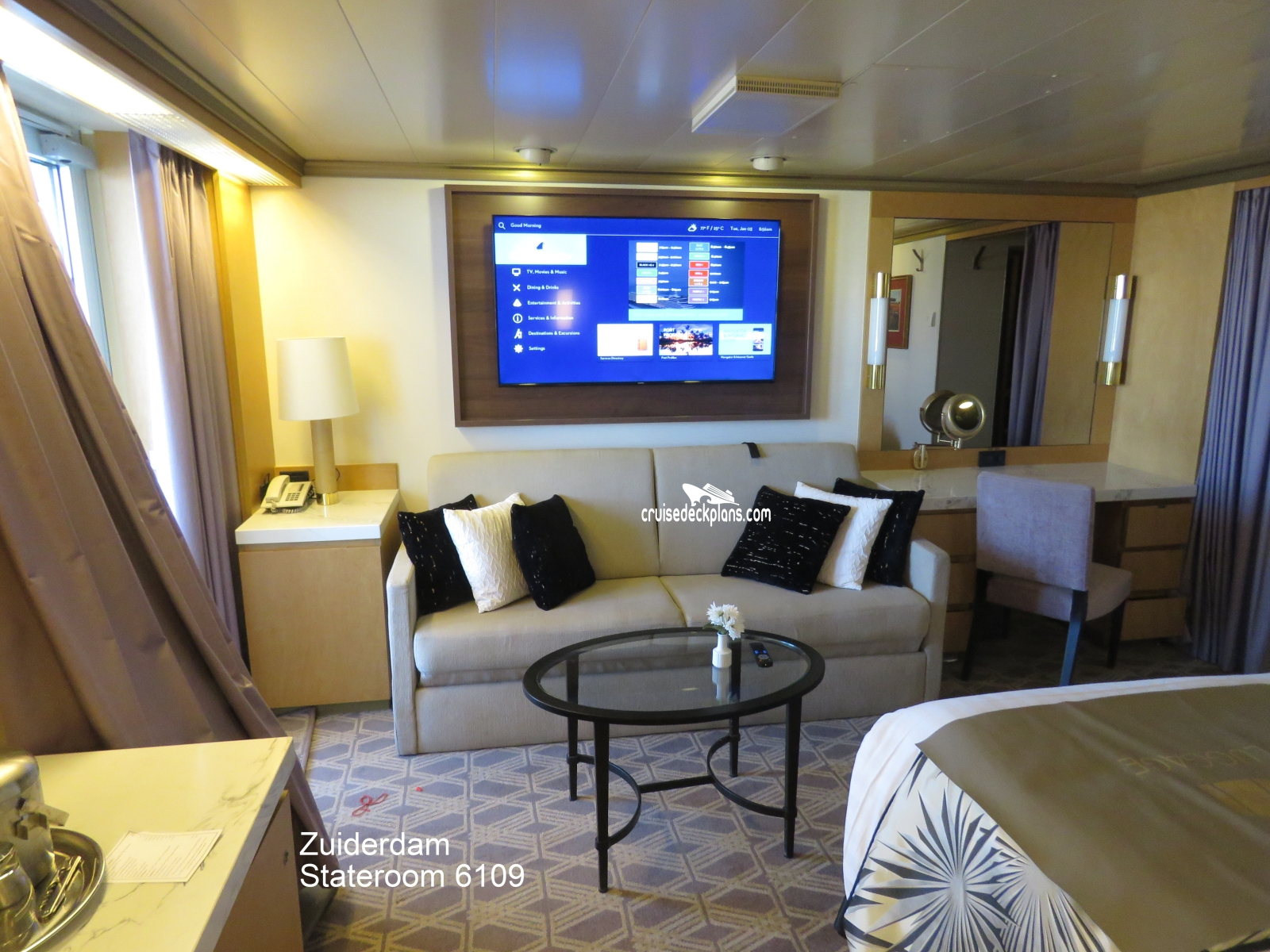 Zuiderdam Signature Suite cabin number 6109 ACTUAL videos and/or pictures, floor plans, diagrams and detailed features including a deck image of the actual location on the Zuiderdam ship for cabin 6109. Cruisedeckplans.com has 72,924 different (staterooms) cabins that have actual cabin pictures and/or cabin videos taken by real cruisers. That is plenty of coverage to provide you with a good sampling of all the different cabins on cruise ships. Take a minute and notice the breadcrumb menu above. This is a quick easy way to navigate our website. You can also use the menu above for menu items specific to the Zuiderdam cruise ship.