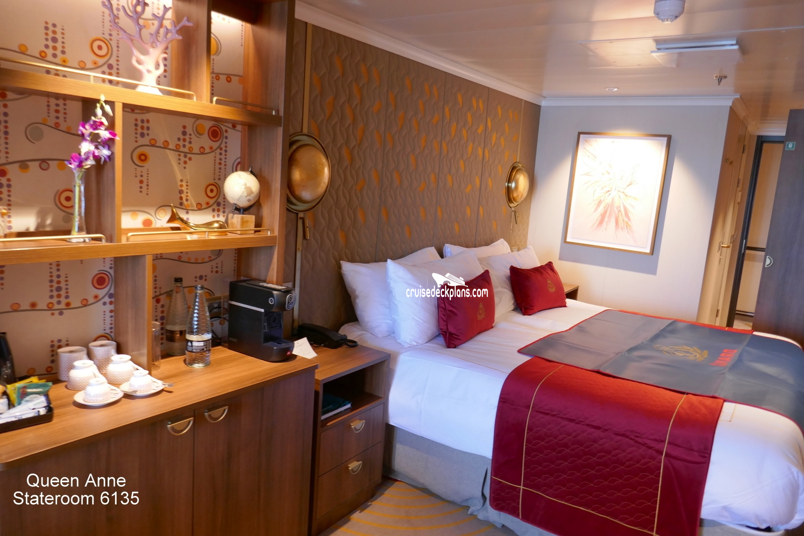 Queen Anne Princess Suite cabin number 6135 ACTUAL videos and/or pictures, floor plans, diagrams and detailed features including a deck image of the actual location on the Queen Anne ship for cabin 6135. Cruisedeckplans.com has 75,885 different (staterooms) cabins that have actual cabin pictures and/or cabin videos taken by real cruisers. That is plenty of coverage to provide you with a good sampling of all the different cabins on cruise ships. Take a minute and notice the breadcrumb menu above. This is a quick easy way to navigate our website. You can also use the menu above for menu items specific to the Queen Anne cruise ship.