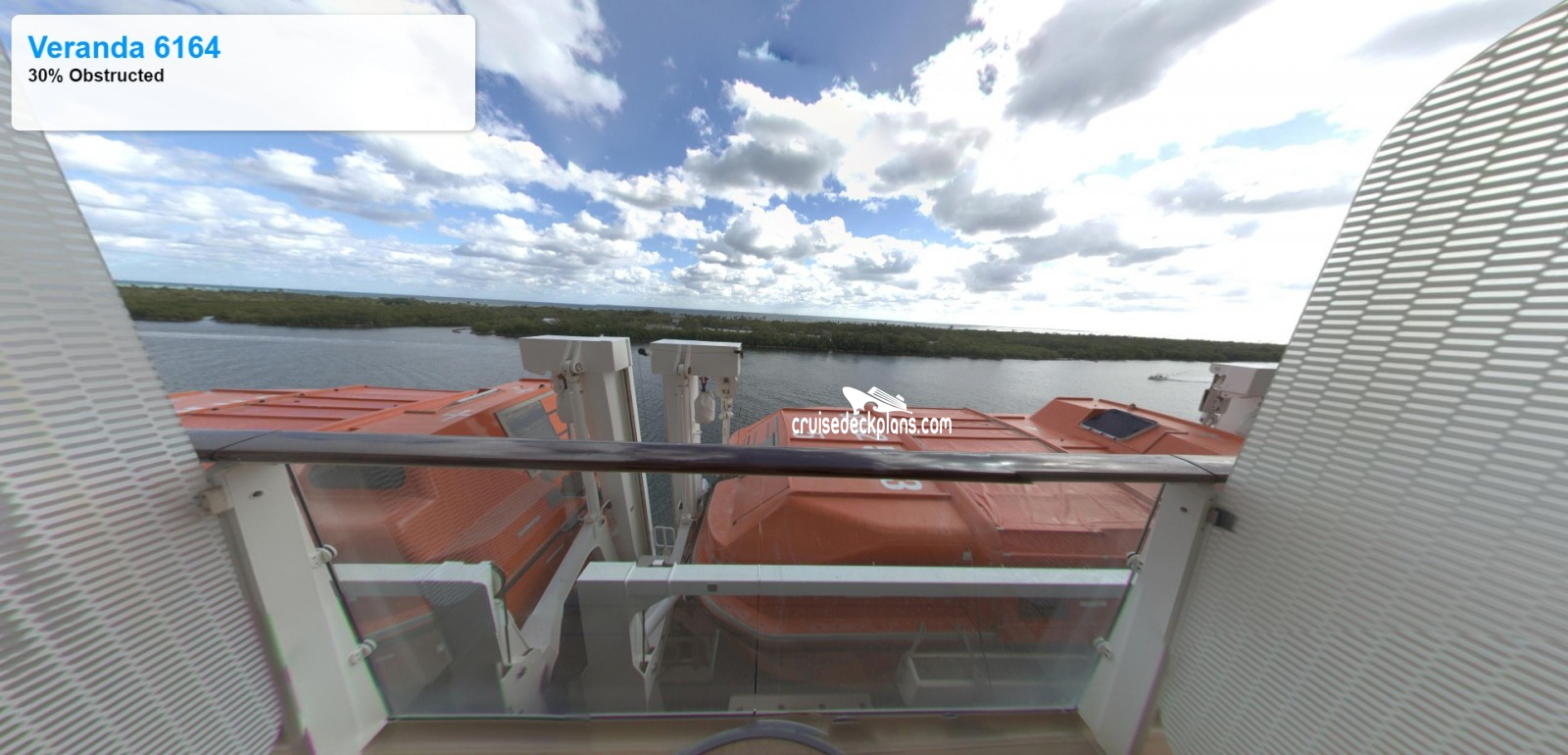 All category V3 cabins have obstructed view when looking down to the water and slightly obstructed horizon view. Category DV and V2 has unobstructed horizon view but obstructed views when looking down to the water (except some forward V2 cabins)