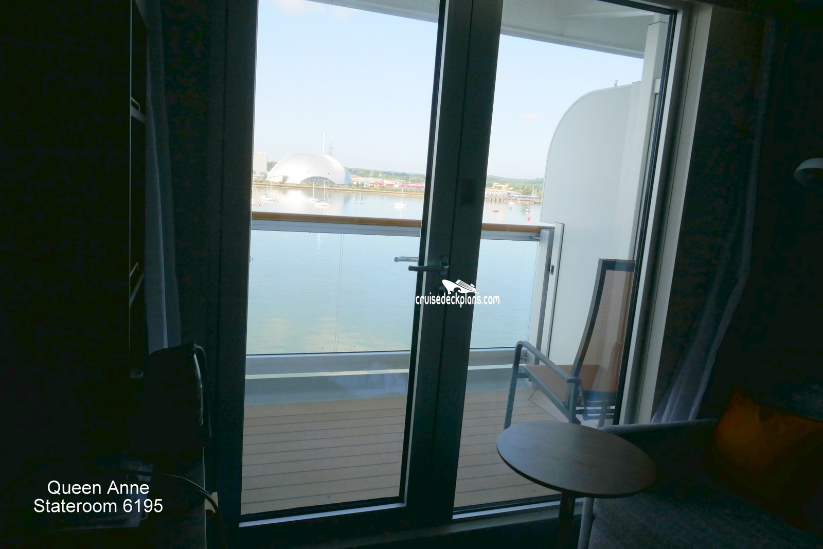 Queen Anne Balcony cabin number 6195 ACTUAL videos and/or pictures, floor plans, diagrams and detailed features including a deck image of the actual location on the Queen Anne ship for cabin 6195. Cruisedeckplans.com has 75,448 different (staterooms) cabins that have actual cabin pictures and/or cabin videos taken by real cruisers. That is plenty of coverage to provide you with a good sampling of all the different cabins on cruise ships. Take a minute and notice the breadcrumb menu above. This is a quick easy way to navigate our website. You can also use the menu above for menu items specific to the Queen Anne cruise ship.