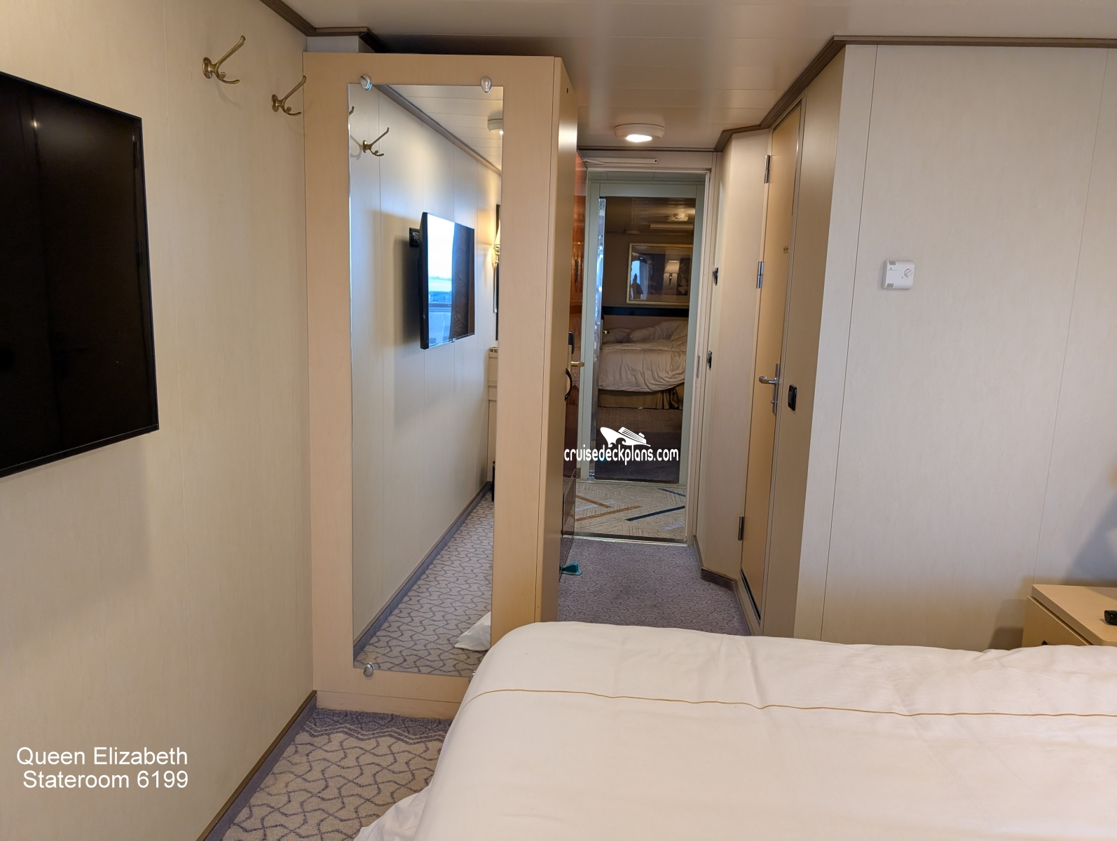 Scroll over cabin (stateroom) tiles below to click and watch actual stateroom videos of Queen Elizabeth cabin 6199. You can choose to watch the videos right on this page, or click to watch them on YouTube (will open in new window). When you are done viewing these videos and/or the cabin pictures above, you can click here to select another cabin. The date shown below is the date video was published. Use this to see decor changes. Keep in mind that stateroom cabins are typically updated once every three to five years. To save you time, Cruisedeckplans.com will spend hours every week finding more actual stateroom videos on YouTube.