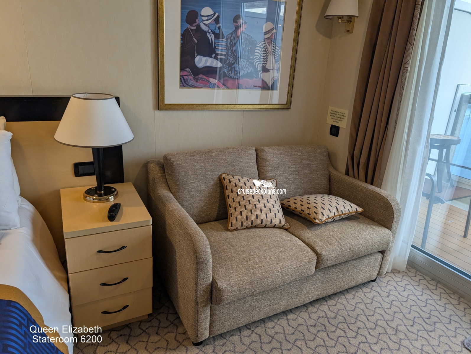 Queen Elizabeth Balcony cabin number 6200 ACTUAL videos and/or pictures, floor plans, diagrams and detailed features including a deck image of the actual location on the Queen Elizabeth ship for cabin 6200. Cruisedeckplans.com has 72,924 different (staterooms) cabins that have actual cabin pictures and/or cabin videos taken by real cruisers. That is plenty of coverage to provide you with a good sampling of all the different cabins on cruise ships. Take a minute and notice the breadcrumb menu above. This is a quick easy way to navigate our website. You can also use the menu above for menu items specific to the Queen Elizabeth cruise ship.