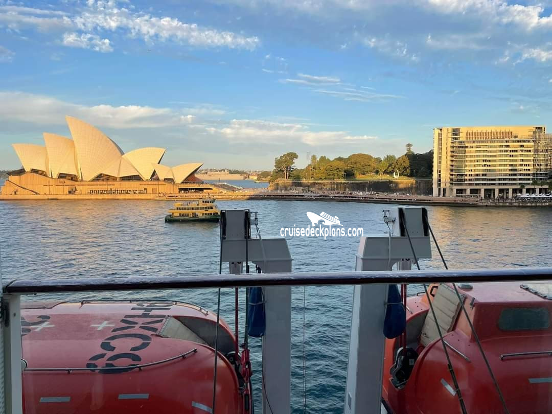 All category V3 cabins have obstructed view when looking down to the water and slightly obstructed horizon view. Category DV and V2 has unobstructed horizon view but obstructed views when looking down to the water (except some forward V2 cabins)