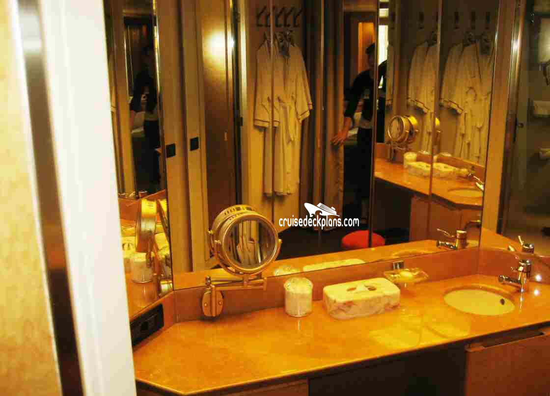 Concierge Service / Priority Check In / Priority Debarkation / Priority Tender Boarding / Afternoon Canapes / Afternoon Tea / Complimentary Shoe Shine / Welcome Champagne / Exclusive Lounge / Exclusive Full Breakfast Restaurant / Priority Dining Reservations / Complimentary Laundry / Thick Cotton Robes / Pillow Menu / Signature Mariner's Dream bed with plush euro-top mattress and finely woven cotton linens / Lighted magnifying mirrors / Massage showerheads / Salon-quality hair dryer / Elemis Aromapure bath products / Flat-panel TV and DVD player / complimentary DVD library / Personalized cruise stationary / Umbrella & binocular usage / Gorgeous corsages and boutonnieres for the first formal night / Cocktail party with ship's officers / Premium duvet / Complimentary bottled water at embarkation / Bose docking station / Complimentary mimosas with in-suite breakfast / In-suite coffee maker and espresso machine. /