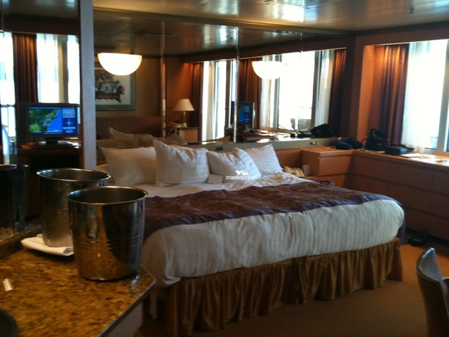 Concierge Service / Priority Check In / Priority Debarkation / Priority Tender Boarding / Afternoon Canapes / Afternoon Tea / Complimentary Shoe Shine / Welcome Champagne / Exclusive Lounge / Exclusive Full Breakfast Restaurant / Priority Dining Reservations / Complimentary Laundry / Thick Cotton Robes / Pillow Menu / Signature Mariner's Dream bed with plush euro-top mattress and finely woven cotton linens / Lighted magnifying mirrors / Massage showerheads / Salon-quality hair dryer / Elemis Aromapure bath products / Flat-panel TV and DVD player / complimentary DVD library / Personalized cruise stationary / Umbrella & binocular usage / Gorgeous corsages and boutonnieres for the first formal night / Cocktail party with ship's officers / Premium duvet / Complimentary bottled water at embarkation / Bose docking station / Complimentary mimosas with in-suite breakfast / In-suite coffee maker and espresso machine. /