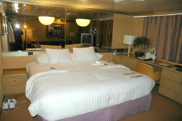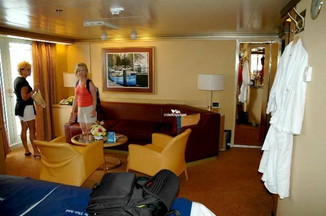 Concierge Service / Priority Check In / Priority Debarkation / Priority Tender Boarding / Afternoon Canapes / Afternoon Tea / Complimentary Shoe Shine / Welcome Champagne / Exclusive Lounge / Exclusive Full Breakfast Restaurant / Priority Dining Reservations / Complimentary Laundry / Thick Cotton Robes / Pillow Menu / Signature Mariner's Dream bed with plush euro-top mattress and finely woven cotton linens / Lighted magnifying mirrors / Massage showerheads / Salon-quality hair dryer / Elemis Aromapure bath products / Flat-panel TV and DVD player / complimentary DVD library / Personalized cruise stationary / Umbrella & binocular usage / Gorgeous corsages and boutonnieres for the first formal night / Cocktail party with ship's officers / Premium duvet / Complimentary bottled water at embarkation / Bose docking station / Complimentary mimosas with in-suite breakfast / In-suite coffee maker and espresso machine. /