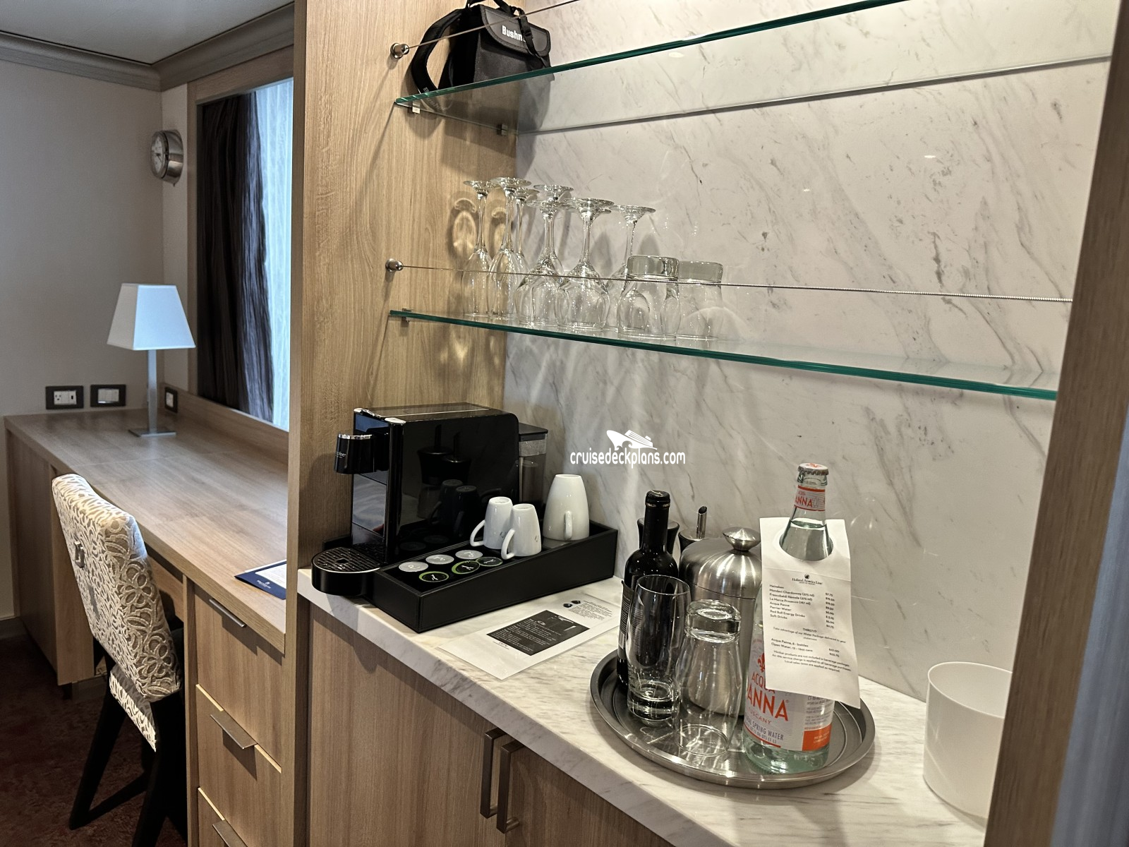 Concierge Service / Priority Check In / Priority Debarkation / Priority Tender Boarding / Afternoon Canapes / Afternoon Tea / Complimentary Shoe Shine / Welcome Champagne / Exclusive Lounge / Exclusive Full Breakfast Restaurant / Priority Dining Reservations / Complimentary Laundry / Thick Cotton Robes / Pillow Menu / Signature Mariner's Dream bed with plush euro-top mattress and finely woven cotton linens / Lighted magnifying mirrors / Massage showerheads / Salon-quality hair dryer / Elemis Aromapure bath products / Flat-panel TV and DVD player / complimentary DVD library / Personalized cruise stationary / Umbrella & binocular usage / Gorgeous corsages and boutonnieres for the first formal night / Cocktail party with ship's officers / Premium duvet / Complimentary bottled water at embarkation / Bose docking station / Complimentary mimosas with in-suite breakfast / In-suite coffee maker and espresso machine. /
