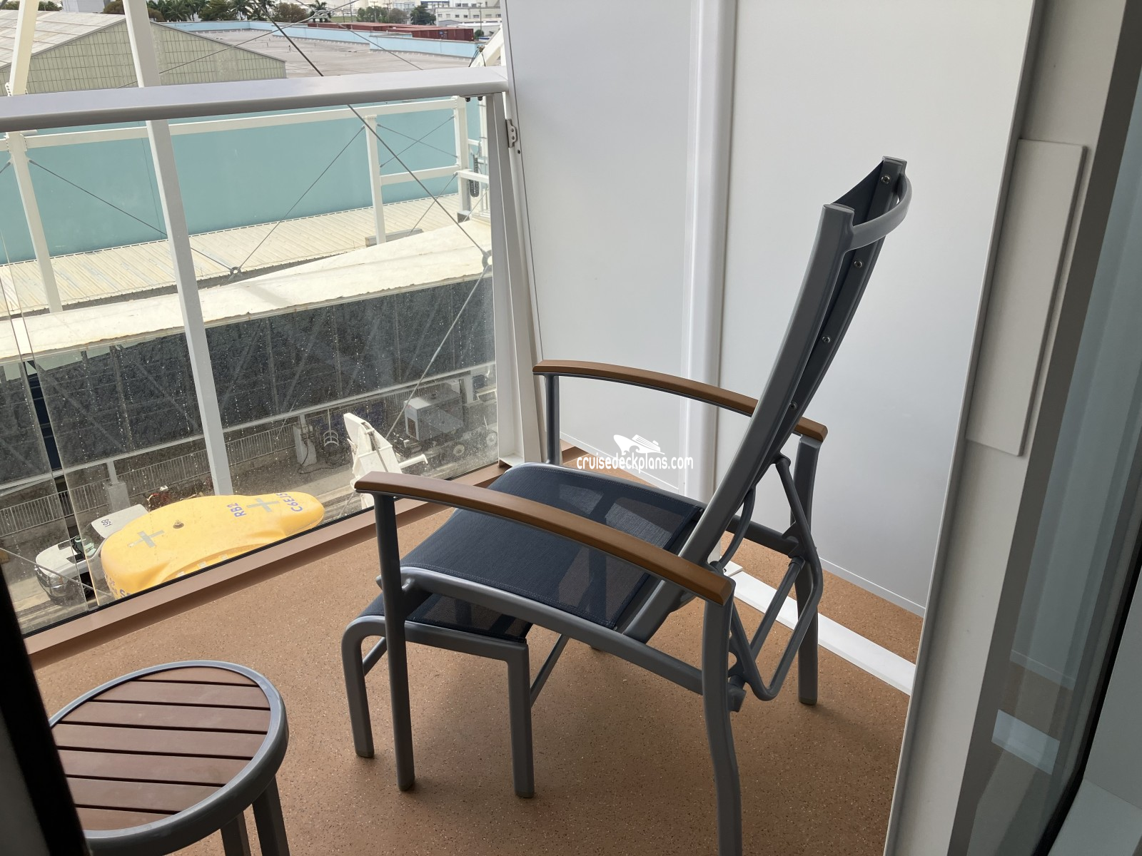 2C (was D1) balconies range from 55 to 119 square feet. Cabins 6254, 6258, 6654, 6658, 7254, 7258, 7654, 7658 have a chair instead of sofa and are 177 square feet with 82 square feet balconies. Category 1E and 2E (was DO) and 2F (was SB) is obstructed by view of top of lifeboat. Forward category 2E (was DO) on deck 7 and deck 8 is obstructed by steel frame that forms porthole opening. Some cabins have sofa near the balcony and others have bed near the balcony.