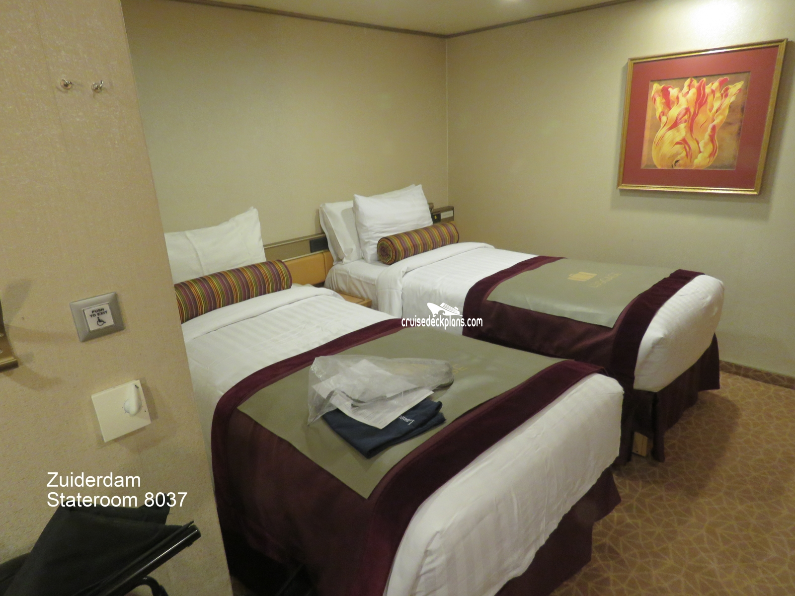These are some actual stateroom pictures of cabin 8037 on the Zuiderdam. Click on images below for larger image and slide show. The slide show will show the date the picture was uploaded to out website. This date is useful because Zuiderdam typically will update its cabins every three to five years with new carpeting and decor. We will keep older pictures for you to compare the more recent photos to. The pictures are sorted by the newest ones first. Most of our cabin pictures are contributed by actual cruisers. We pay 50 cents for any that we use. You can upload your cabin photos HERE. Afer you are done looking at these photos and/or the videos below you can click here to select another cabin.