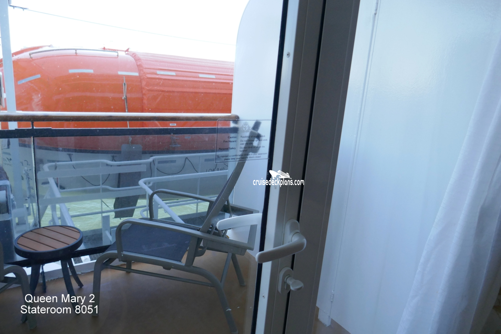 Queen Mary 2 Balcony cabin number 8051 ACTUAL videos and/or pictures, floor plans, diagrams and detailed features including a deck image of the actual location on the Queen Mary 2 ship for cabin 8051. Cruisedeckplans.com has 75,883 different (staterooms) cabins that have actual cabin pictures and/or cabin videos taken by real cruisers. That is plenty of coverage to provide you with a good sampling of all the different cabins on cruise ships. Take a minute and notice the breadcrumb menu above. This is a quick easy way to navigate our website. You can also use the menu above for menu items specific to the Queen Mary 2 cruise ship.