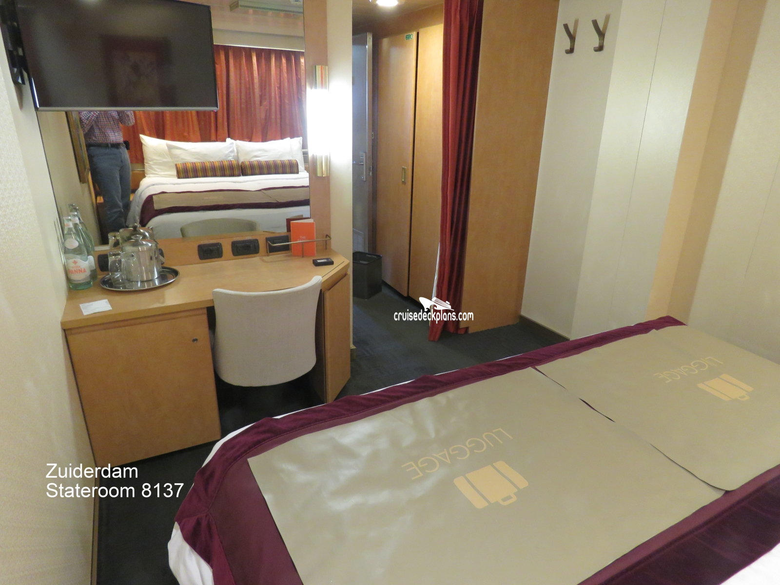 These are some actual stateroom pictures of cabin 8137 on the Zuiderdam. Click on images below for larger image and slide show. The slide show will show the date the picture was uploaded to out website. This date is useful because Zuiderdam typically will update its cabins every three to five years with new carpeting and decor. We will keep older pictures for you to compare the more recent photos to. The pictures are sorted by the newest ones first. Most of our cabin pictures are contributed by actual cruisers. We pay 50 cents for any that we use. You can upload your cabin photos HERE. Afer you are done looking at these photos and/or the videos below you can click here to select another cabin.