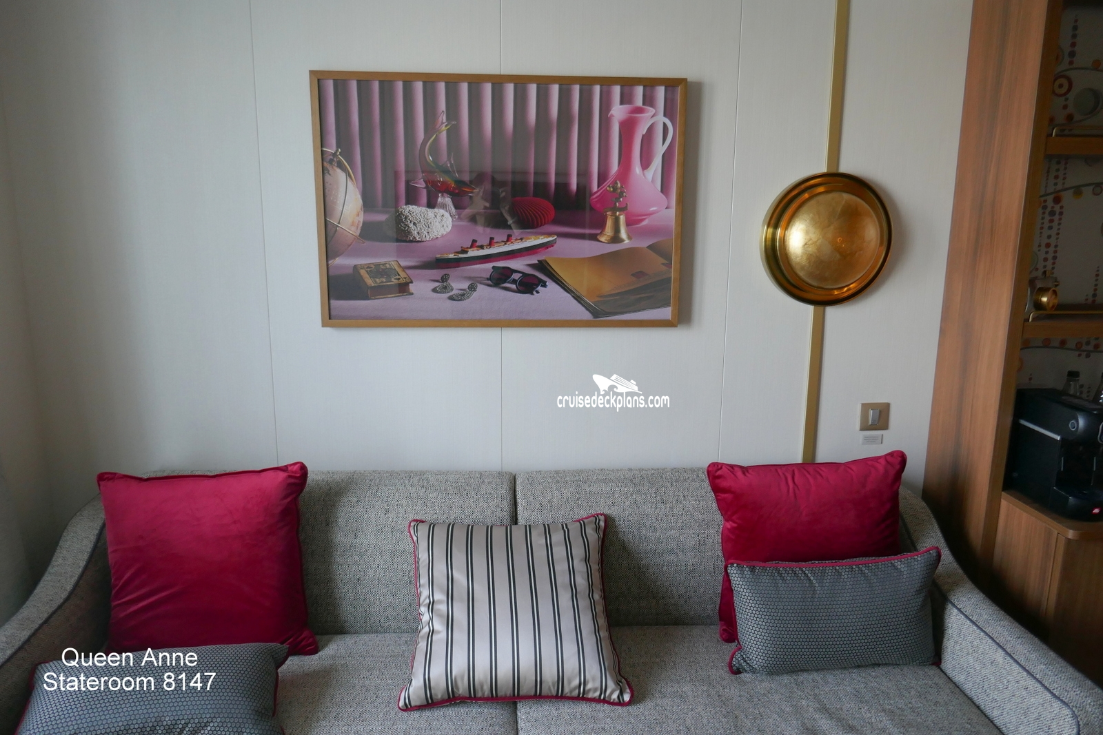 Queen Anne Princess Suite cabin number 8147 ACTUAL videos and/or pictures, floor plans, diagrams and detailed features including a deck image of the actual location on the Queen Anne ship for cabin 8147. Cruisedeckplans.com has 74,910 different (staterooms) cabins that have actual cabin pictures and/or cabin videos taken by real cruisers. That is plenty of coverage to provide you with a good sampling of all the different cabins on cruise ships. Take a minute and notice the breadcrumb menu above. This is a quick easy way to navigate our website. You can also use the menu above for menu items specific to the Queen Anne cruise ship.