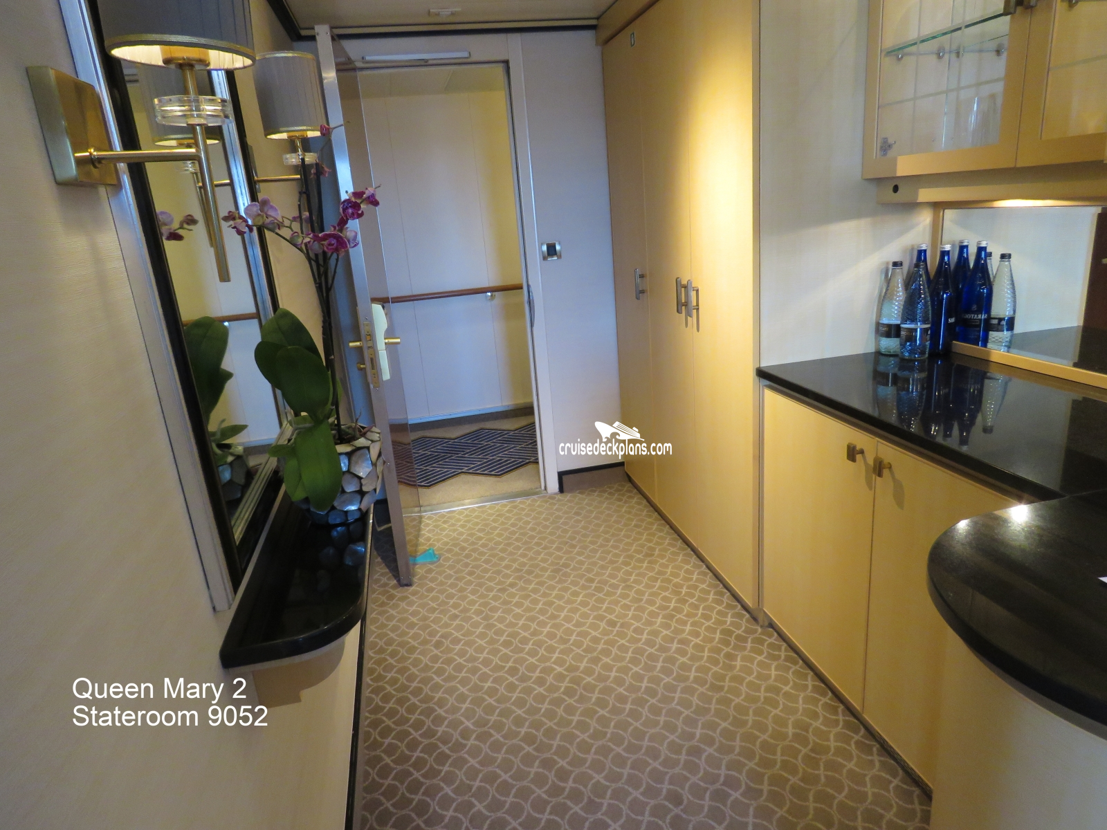 Queen Mary 2 Queens Suite cabin number 9052 ACTUAL videos and/or pictures, floor plans, diagrams and detailed features including a deck image of the actual location on the Queen Mary 2 ship for cabin 9052. Cruisedeckplans.com has 75,170 different (staterooms) cabins that have actual cabin pictures and/or cabin videos taken by real cruisers. That is plenty of coverage to provide you with a good sampling of all the different cabins on cruise ships. Take a minute and notice the breadcrumb menu above. This is a quick easy way to navigate our website. You can also use the menu above for menu items specific to the Queen Mary 2 cruise ship.