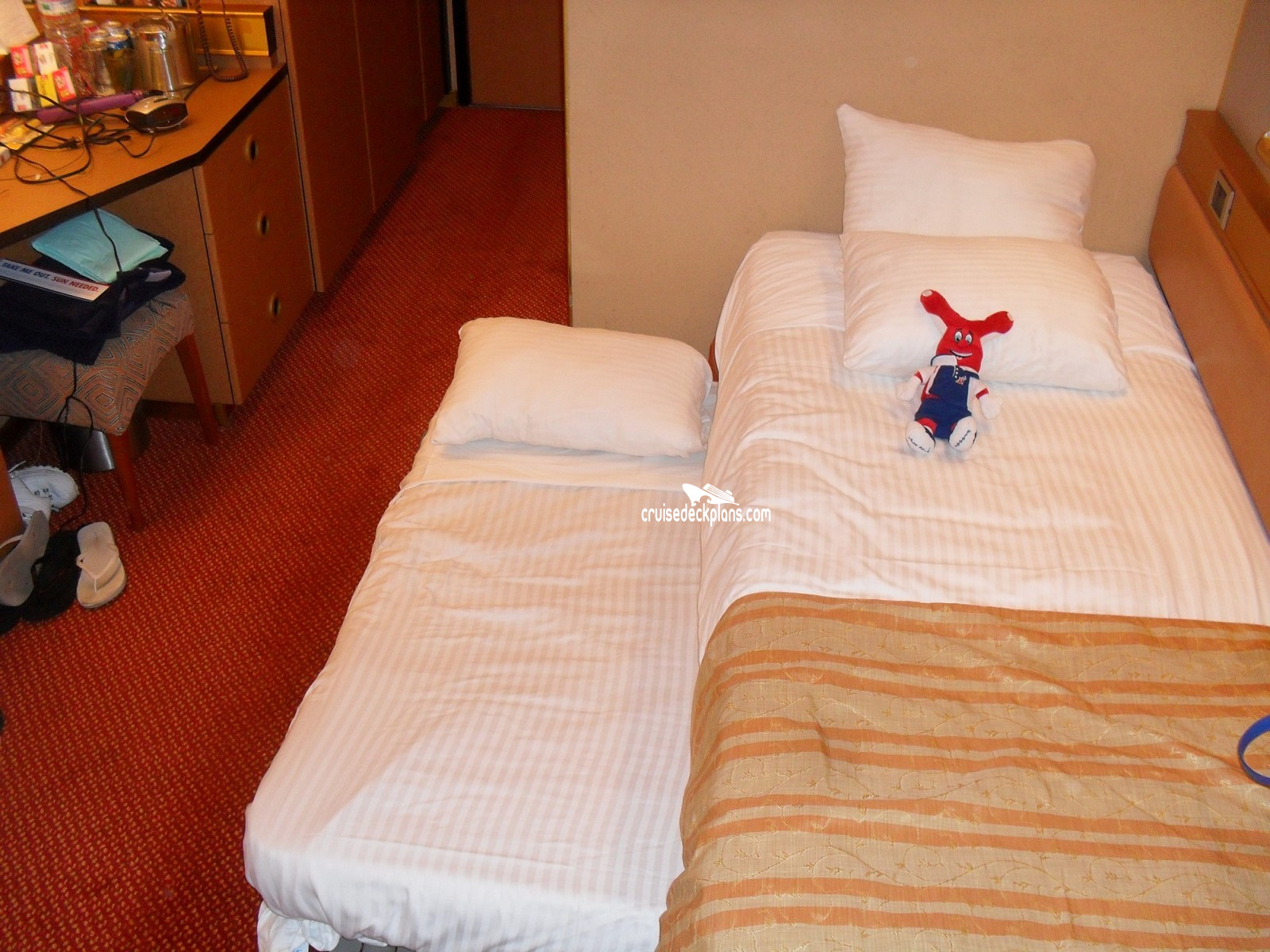 These are some actual stateroom pictures of cabin 9243 on the Carnival Triumph. Click on images below for larger image and slide show. The slide show will show the date the picture was uploaded to out website. This date is useful because Carnival Triumph typically will update its cabins every three to five years with new carpeting and decor. We will keep older pictures for you to compare the more recent photos to. The pictures are sorted by the newest ones first. Most of our cabin pictures are contributed by actual cruisers. We pay 50 cents for any that we use. You can upload your cabin photos HERE. Afer you are done looking at these photos and/or the videos below you can click here to select another cabin.