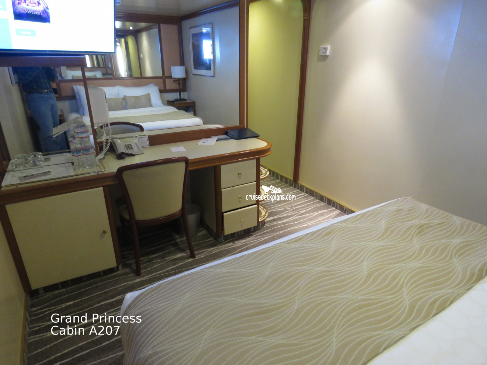 These are some actual stateroom pictures of cabin A207 on the Grand Princess. Click on images below for larger image and slide show. The slide show will show the date the picture was uploaded to out website. This date is useful because Grand Princess typically will update its cabins every three to five years with new carpeting and decor. We will keep older pictures for you to compare the more recent photos to. The pictures are sorted by the newest ones first. Most of our cabin pictures are contributed by actual cruisers. We pay 50 cents for any that we use. You can upload your cabin photos HERE. Afer you are done looking at these photos and/or the videos below you can click here to select another cabin.