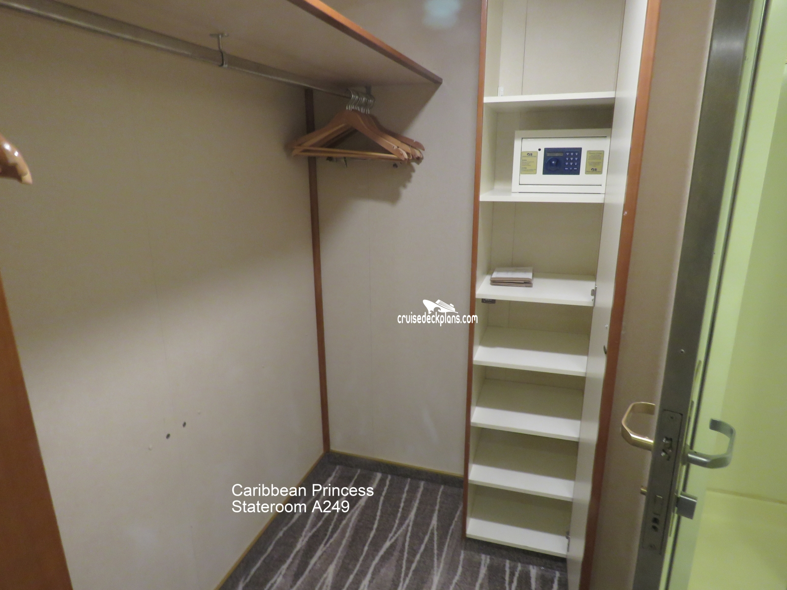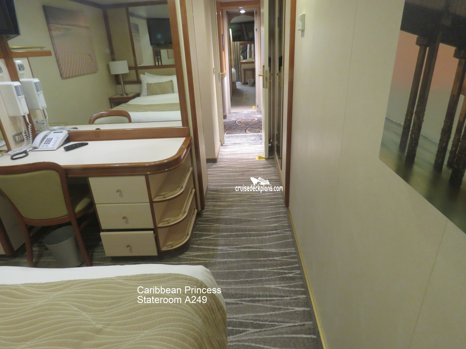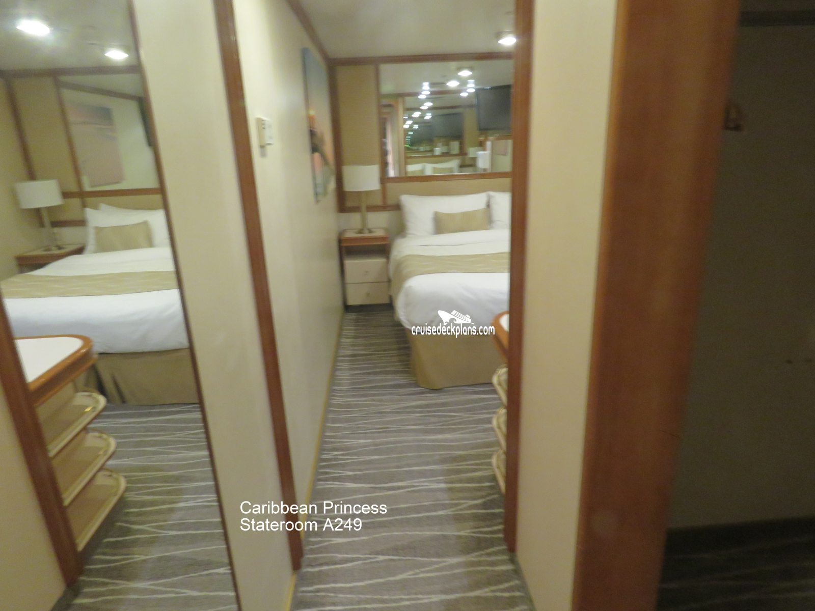 Caribbean Princess Interior cabin number A249 ACTUAL videos and/or pictures, floor plans, diagrams and detailed features including a deck image of the actual location on the Caribbean Princess ship for cabin A249. Cruisedeckplans.com has 74,773 different (staterooms) cabins that have actual cabin pictures and/or cabin videos taken by real cruisers. That is plenty of coverage to provide you with a good sampling of all the different cabins on cruise ships. Take a minute and notice the breadcrumb menu above. This is a quick easy way to navigate our website. You can also use the menu above for menu items specific to the Caribbean Princess cruise ship.