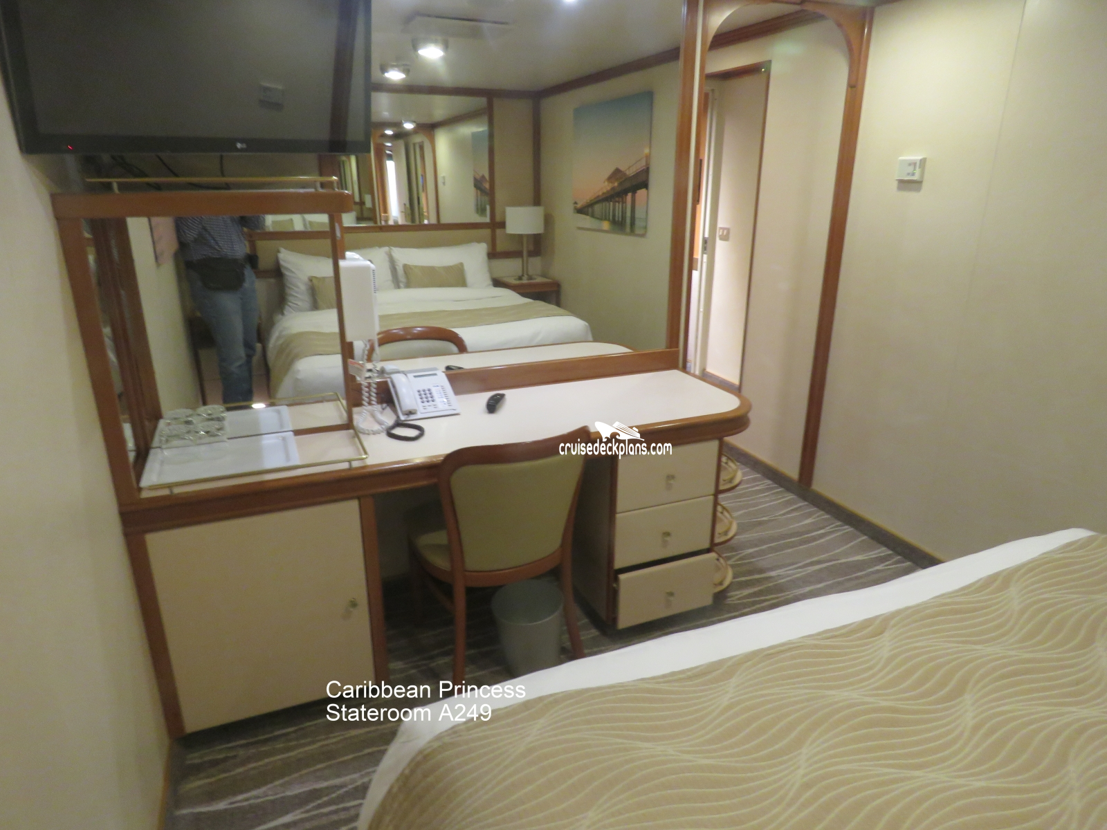 These are some actual stateroom pictures of cabin A249 on the Caribbean Princess. Click on images below for larger image and slide show. The slide show will show the date the picture was uploaded to out website. This date is useful because Caribbean Princess typically will update its cabins every three to five years with new carpeting and decor. We will keep older pictures for you to compare the more recent photos to. The pictures are sorted by the newest ones first. Most of our cabin pictures are contributed by actual cruisers. We pay 50 cents for any that we use. You can upload your cabin photos HERE. Afer you are done looking at these photos and/or the videos below you can click here to select another cabin.