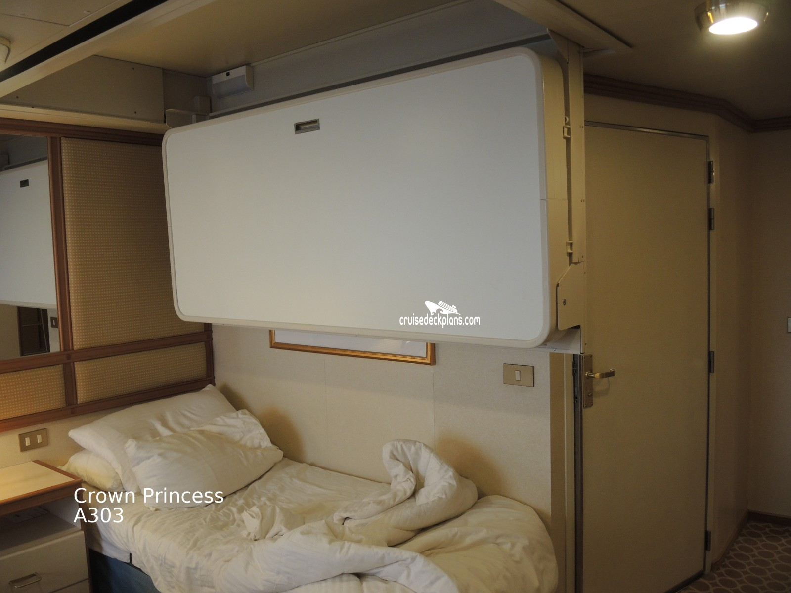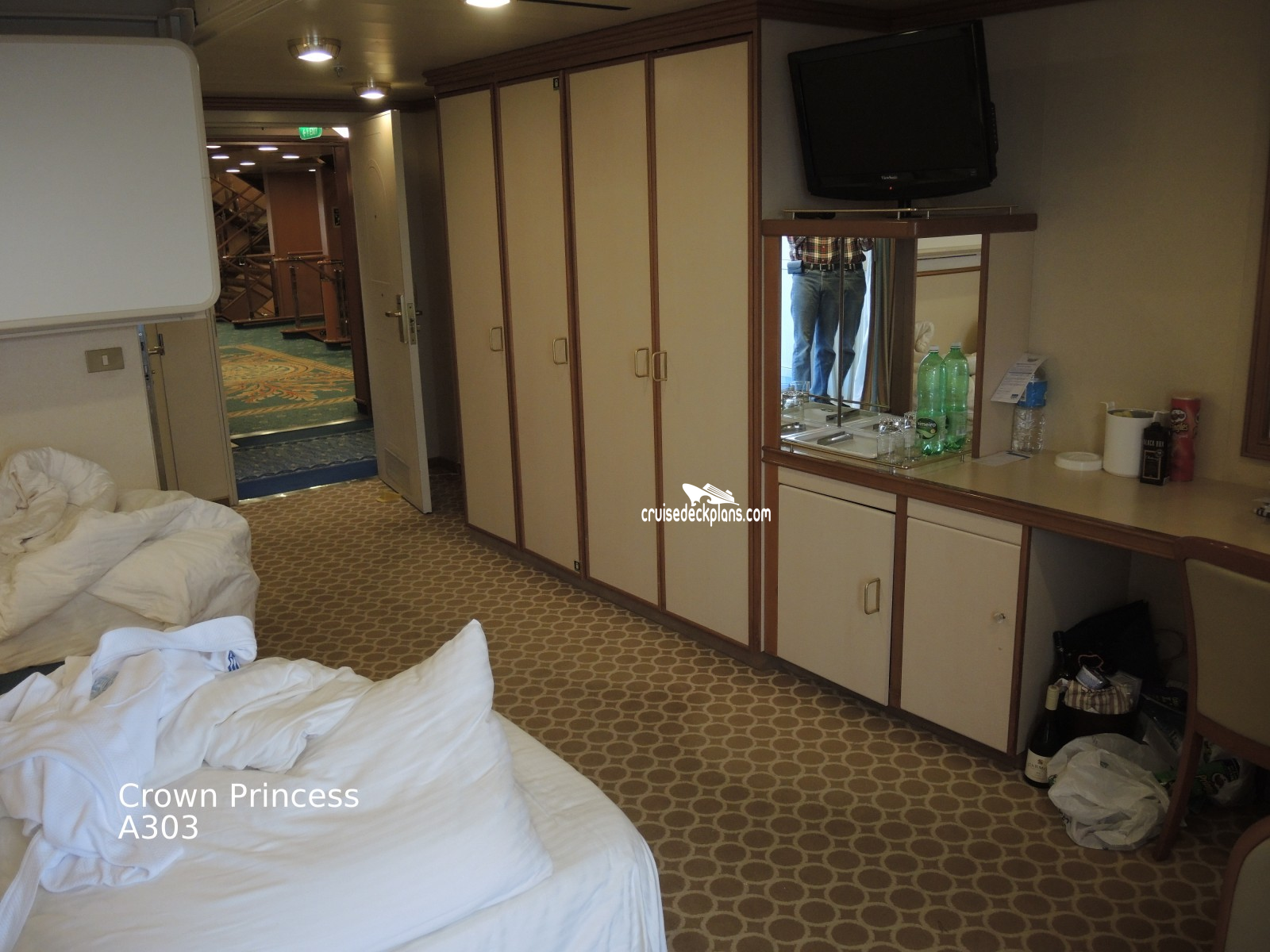 These are some actual stateroom pictures of cabin A303 on the Crown Princess. Click on images below for larger image and slide show. The slide show will show the date the picture was uploaded to out website. This date is useful because Crown Princess typically will update its cabins every three to five years with new carpeting and decor. We will keep older pictures for you to compare the more recent photos to. The pictures are sorted by the newest ones first. Most of our cabin pictures are contributed by actual cruisers. We pay 50 cents for any that we use. You can upload your cabin photos HERE. Afer you are done looking at these photos and/or the videos below you can click here to select another cabin.