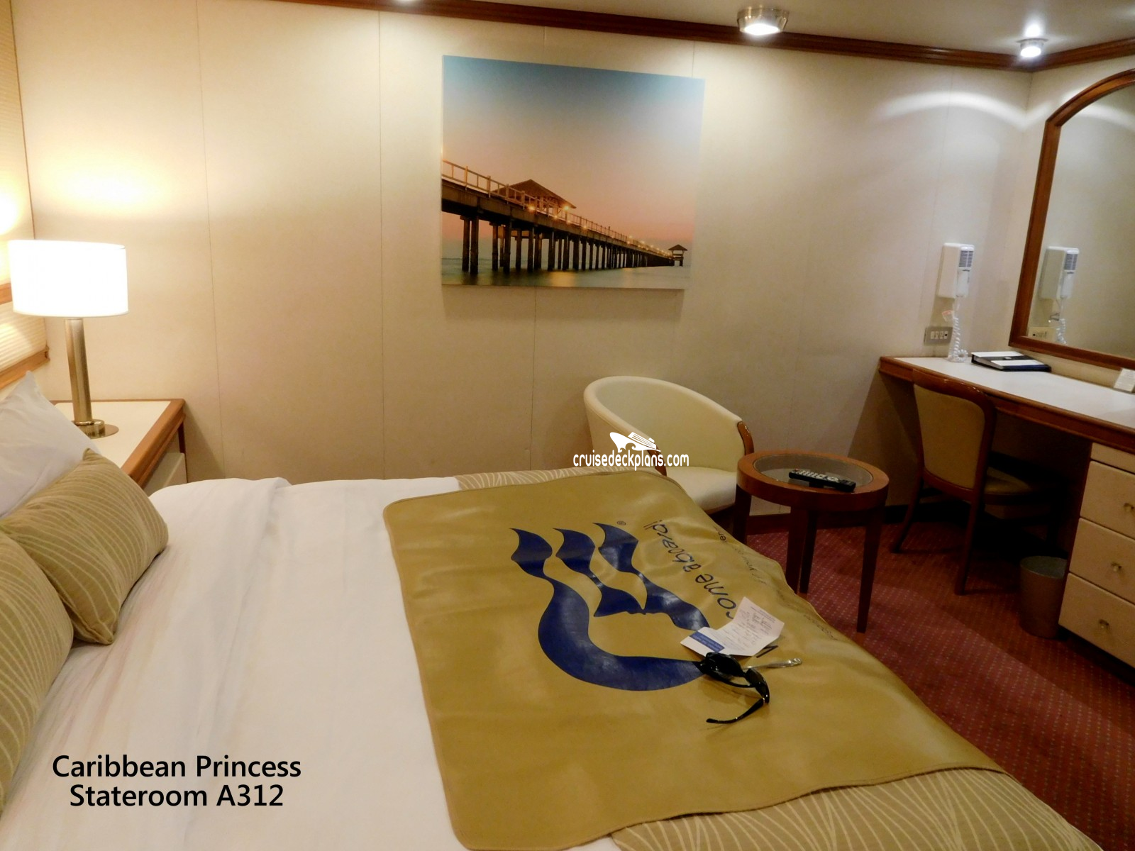 These are some actual stateroom pictures of cabin A312 on the Caribbean Princess. Click on images below for larger image and slide show. The slide show will show the date the picture was uploaded to out website. This date is useful because Caribbean Princess typically will update its cabins every three to five years with new carpeting and decor. We will keep older pictures for you to compare the more recent photos to. The pictures are sorted by the newest ones first. Most of our cabin pictures are contributed by actual cruisers. We pay 50 cents for any that we use. You can upload your cabin photos HERE. Afer you are done looking at these photos and/or the videos below you can click here to select another cabin.