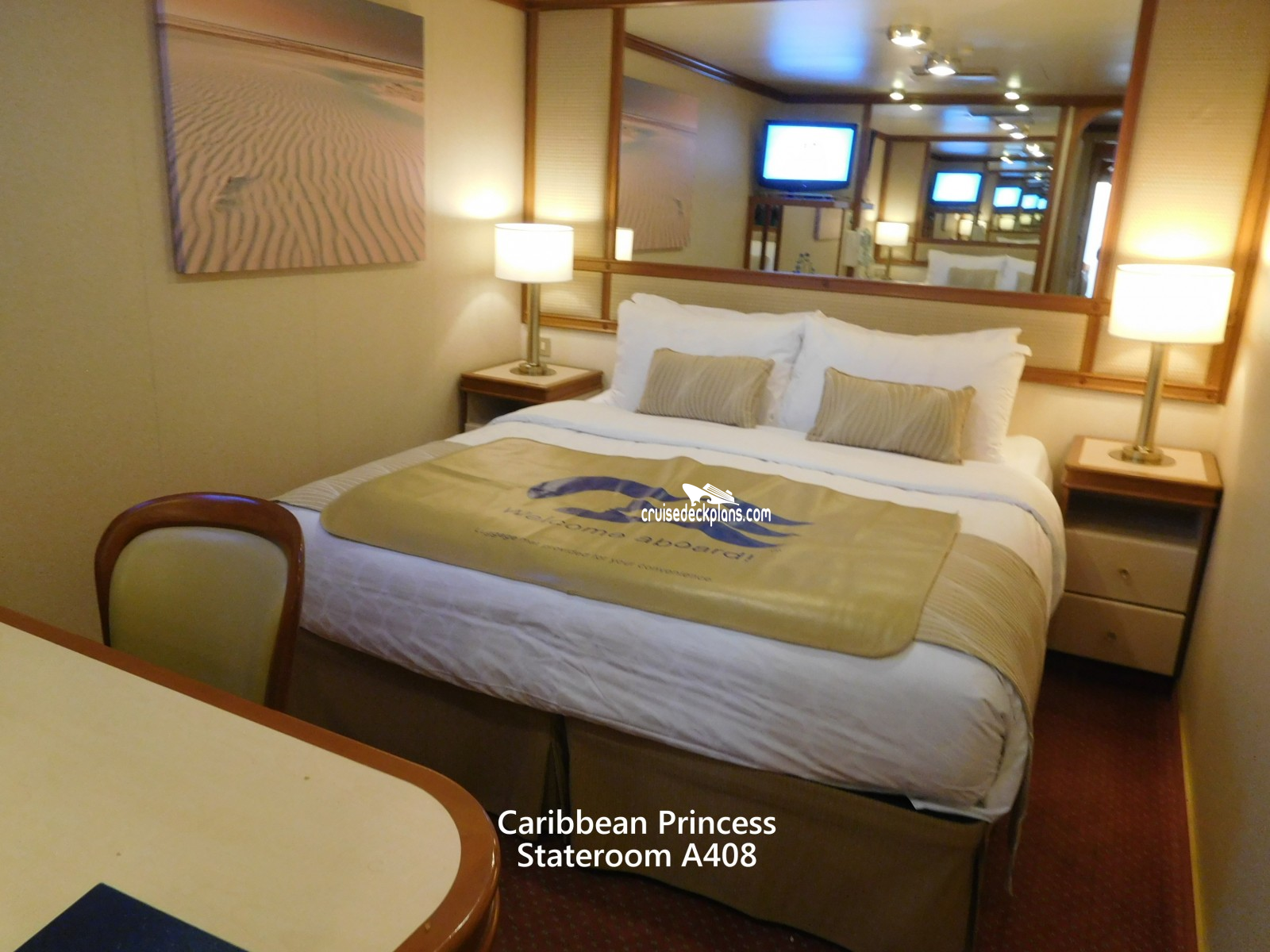These are some actual stateroom pictures of cabin A408 on the Caribbean Princess. Click on images below for larger image and slide show. The slide show will show the date the picture was uploaded to out website. This date is useful because Caribbean Princess typically will update its cabins every three to five years with new carpeting and decor. We will keep older pictures for you to compare the more recent photos to. The pictures are sorted by the newest ones first. Most of our cabin pictures are contributed by actual cruisers. We pay 50 cents for any that we use. You can upload your cabin photos HERE. Afer you are done looking at these photos and/or the videos below you can click here to select another cabin.
