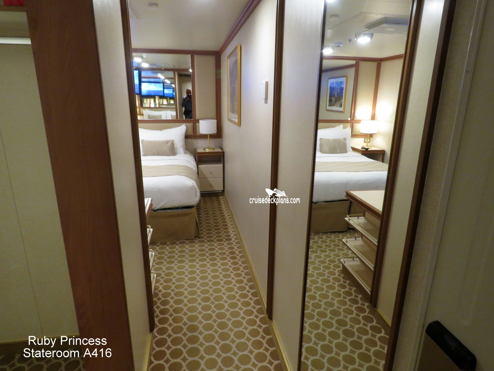 Ruby Princess Interior cabin number A416 ACTUAL videos and/or pictures, floor plans, diagrams and detailed features including a deck image of the actual location on the Ruby Princess ship for cabin A416. Cruisedeckplans.com has 73,269 different (staterooms) cabins that have actual cabin pictures and/or cabin videos taken by real cruisers. That is plenty of coverage to provide you with a good sampling of all the different cabins on cruise ships. Take a minute and notice the breadcrumb menu above. This is a quick easy way to navigate our website. You can also use the menu above for menu items specific to the Ruby Princess cruise ship.