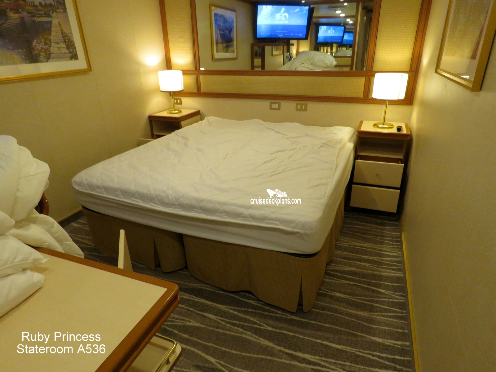 These are some actual stateroom pictures of cabin A536 on the Ruby Princess. Click on images below for larger image and slide show. The slide show will show the date the picture was uploaded to out website. This date is useful because Ruby Princess typically will update its cabins every three to five years with new carpeting and decor. We will keep older pictures for you to compare the more recent photos to. The pictures are sorted by the newest ones first. Most of our cabin pictures are contributed by actual cruisers. We pay 50 cents for any that we use. You can upload your cabin photos HERE. Afer you are done looking at these photos and/or the videos below you can click here to select another cabin.