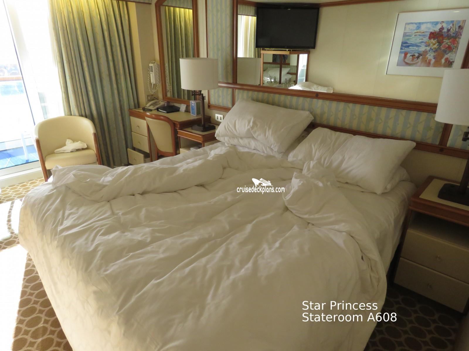 These are some actual stateroom pictures of cabin A608 on the Star Princess II. Click on images below for larger image and slide show. The slide show will show the date the picture was uploaded to out website. This date is useful because Star Princess II typically will update its cabins every three to five years with new carpeting and decor. We will keep older pictures for you to compare the more recent photos to. The pictures are sorted by the newest ones first. Most of our cabin pictures are contributed by actual cruisers. We pay 50 cents for any that we use. You can upload your cabin photos HERE. Afer you are done looking at these photos and/or the videos below you can click here to select another cabin.
