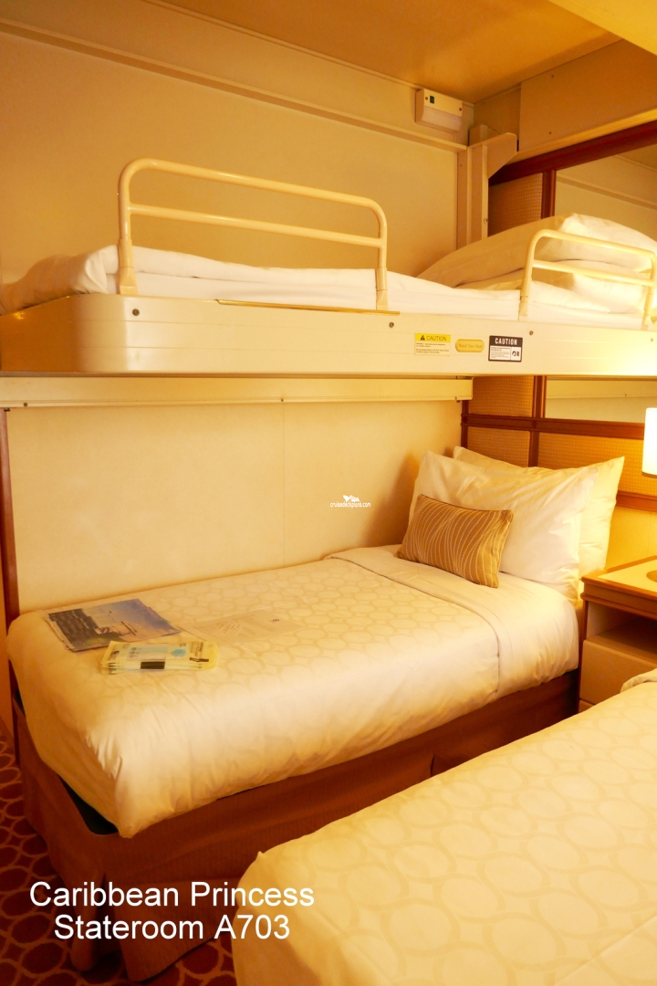 These are some actual stateroom pictures of cabin A703 on the Caribbean Princess. Click on images below for larger image and slide show. The slide show will show the date the picture was uploaded to out website. This date is useful because Caribbean Princess typically will update its cabins every three to five years with new carpeting and decor. We will keep older pictures for you to compare the more recent photos to. The pictures are sorted by the newest ones first. Most of our cabin pictures are contributed by actual cruisers. We pay 50 cents for any that we use. You can upload your cabin photos HERE. Afer you are done looking at these photos and/or the videos below you can click here to select another cabin.