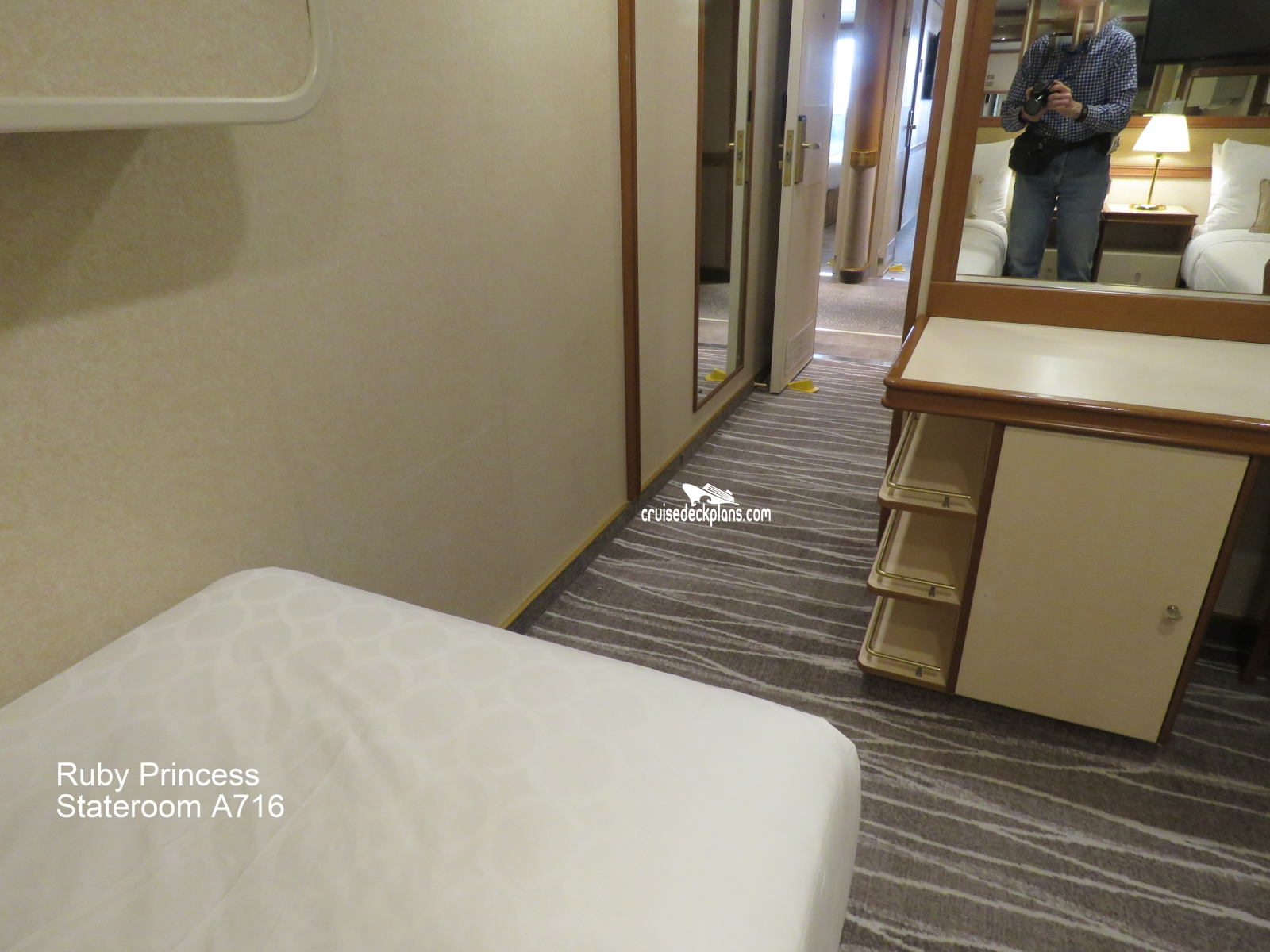 Ruby Princess Interior cabin number A716 ACTUAL videos and/or pictures, floor plans, diagrams and detailed features including a deck image of the actual location on the Ruby Princess ship for cabin A716. Cruisedeckplans.com has 72,948 different (staterooms) cabins that have actual cabin pictures and/or cabin videos taken by real cruisers. That is plenty of coverage to provide you with a good sampling of all the different cabins on cruise ships. Take a minute and notice the breadcrumb menu above. This is a quick easy way to navigate our website. You can also use the menu above for menu items specific to the Ruby Princess cruise ship.