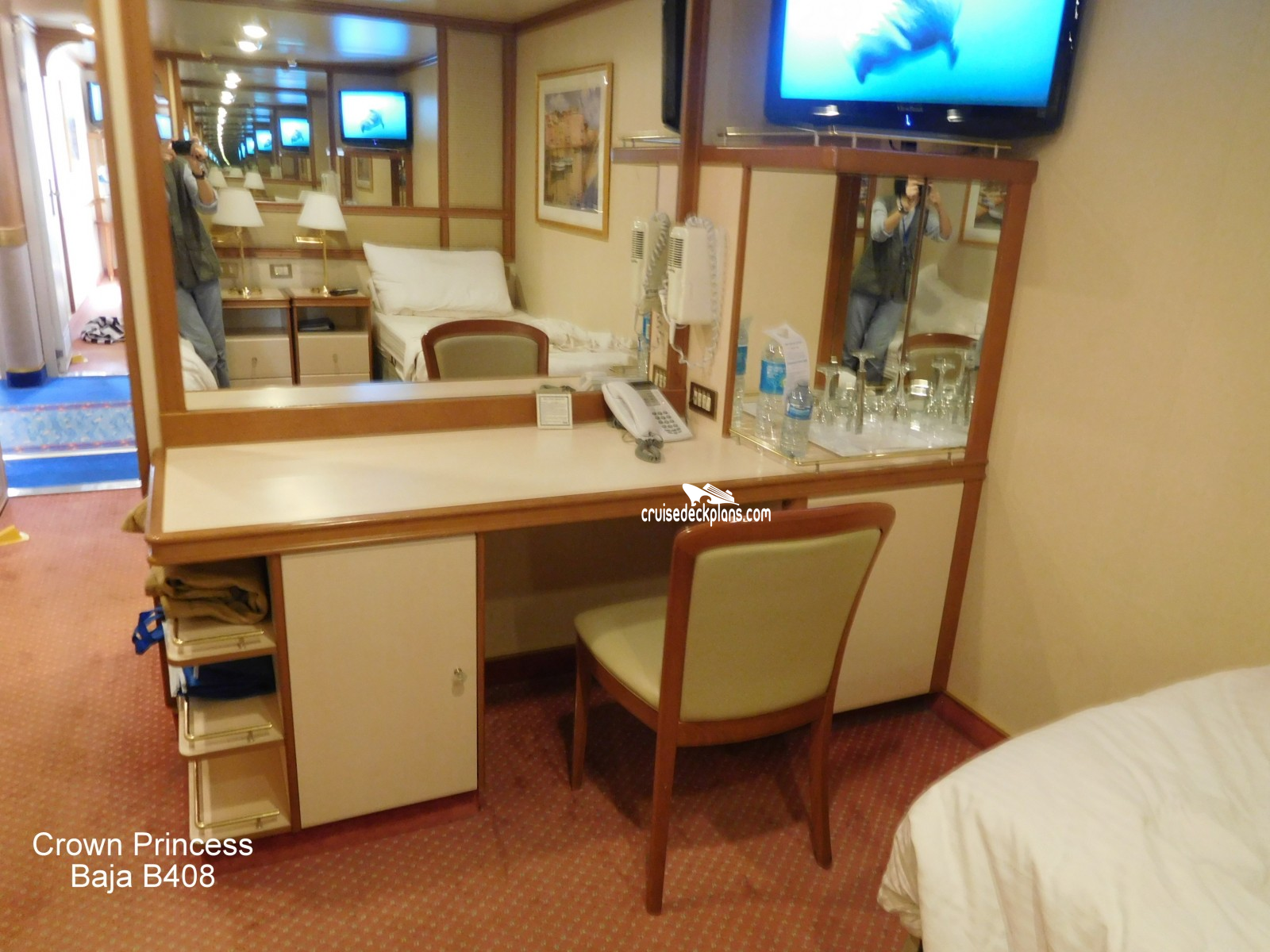 These are some actual stateroom pictures of cabin B408 on the Crown Princess. Click on images below for larger image and slide show. The slide show will show the date the picture was uploaded to out website. This date is useful because Crown Princess typically will update its cabins every three to five years with new carpeting and decor. We will keep older pictures for you to compare the more recent photos to. The pictures are sorted by the newest ones first. Most of our cabin pictures are contributed by actual cruisers. We pay 50 cents for any that we use. You can upload your cabin photos HERE. Afer you are done looking at these photos and/or the videos below you can click here to select another cabin.
