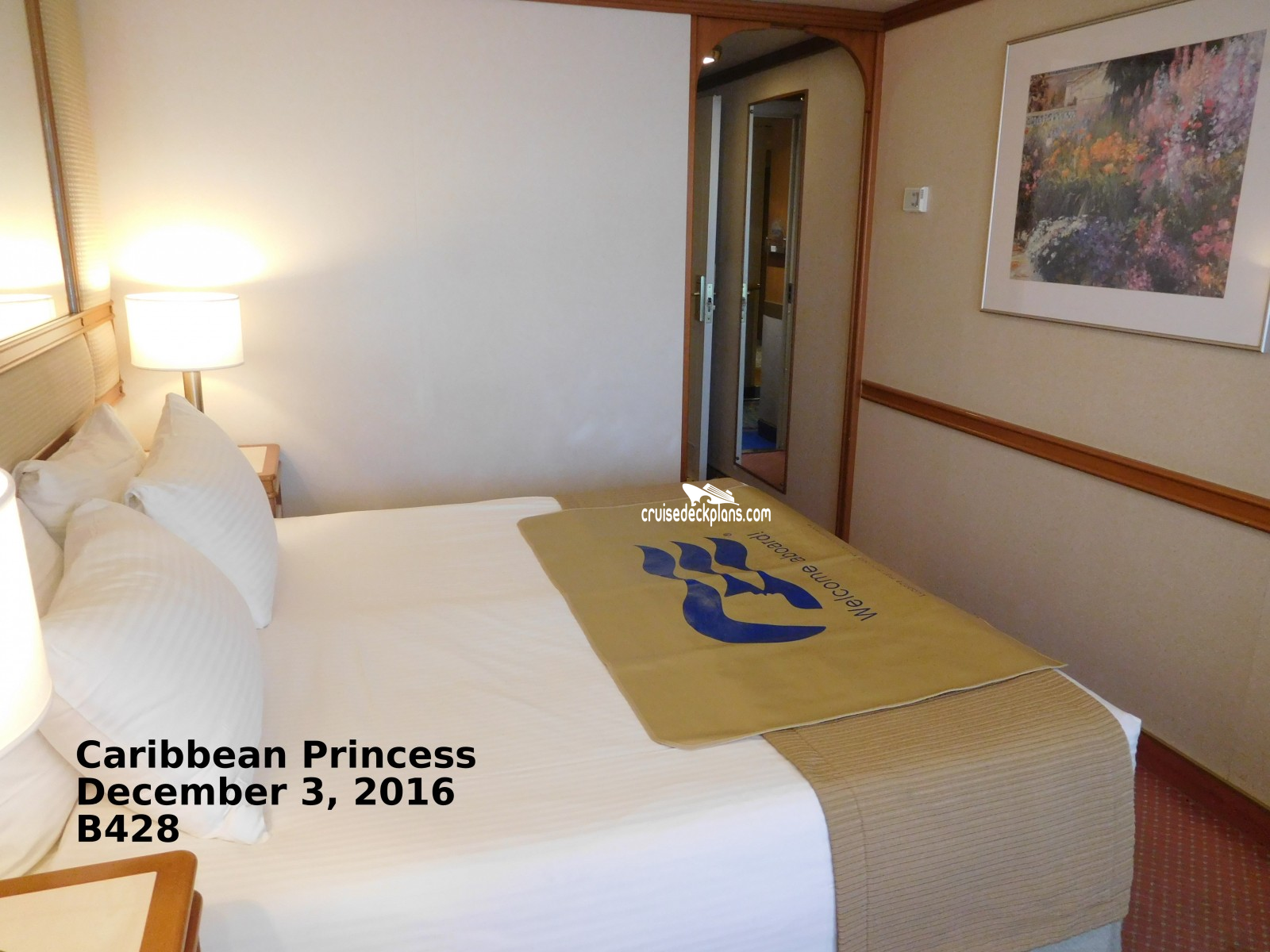 These are some actual stateroom pictures of cabin B428 on the Caribbean Princess. Click on images below for larger image and slide show. The slide show will show the date the picture was uploaded to out website. This date is useful because Caribbean Princess typically will update its cabins every three to five years with new carpeting and decor. We will keep older pictures for you to compare the more recent photos to. The pictures are sorted by the newest ones first. Most of our cabin pictures are contributed by actual cruisers. We pay 50 cents for any that we use. You can upload your cabin photos HERE. Afer you are done looking at these photos and/or the videos below you can click here to select another cabin.