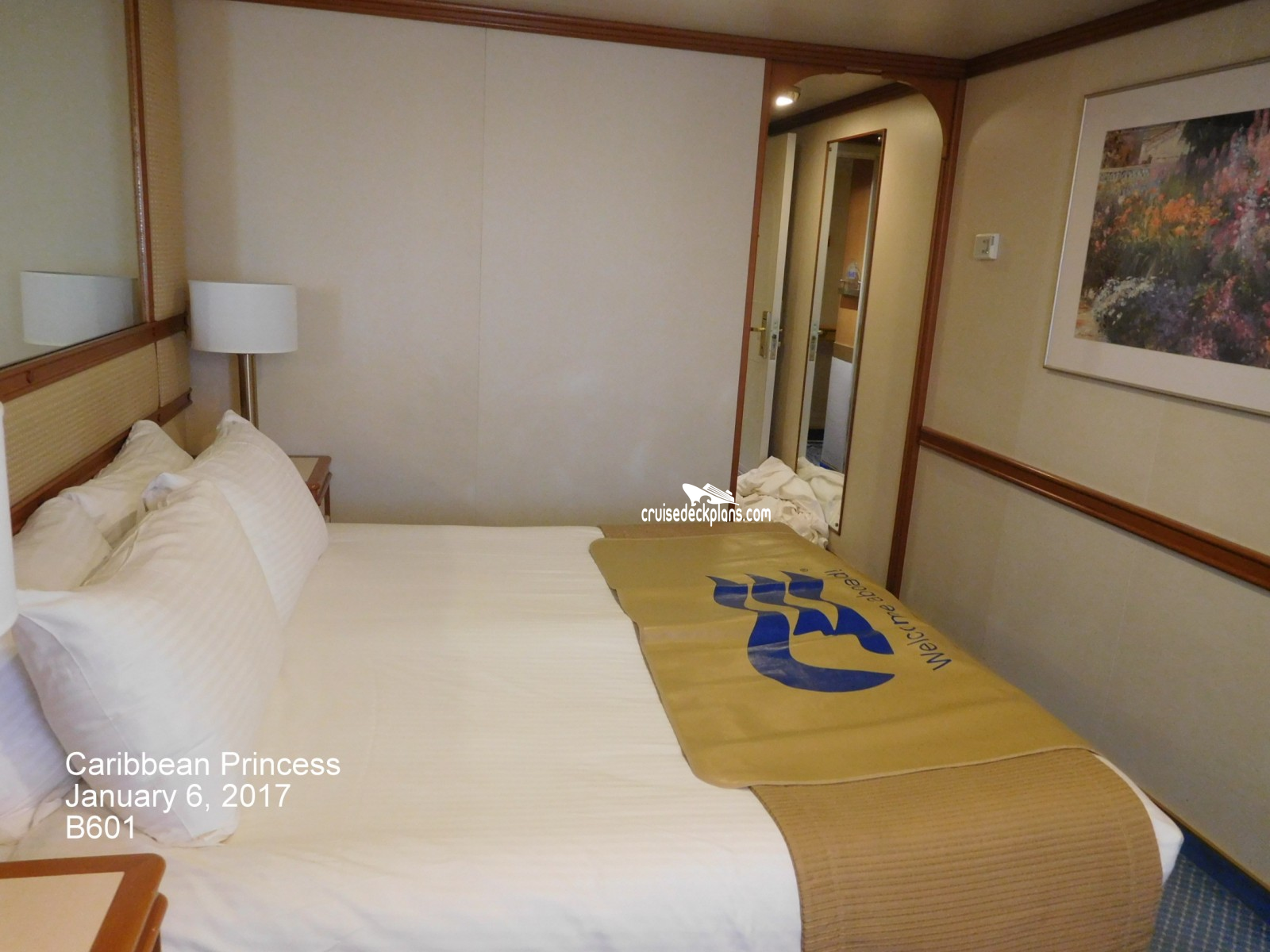 These are some actual stateroom pictures of cabin B601 on the Caribbean Princess. Click on images below for larger image and slide show. The slide show will show the date the picture was uploaded to out website. This date is useful because Caribbean Princess typically will update its cabins every three to five years with new carpeting and decor. We will keep older pictures for you to compare the more recent photos to. The pictures are sorted by the newest ones first. Most of our cabin pictures are contributed by actual cruisers. We pay 50 cents for any that we use. You can upload your cabin photos HERE. Afer you are done looking at these photos and/or the videos below you can click here to select another cabin.
