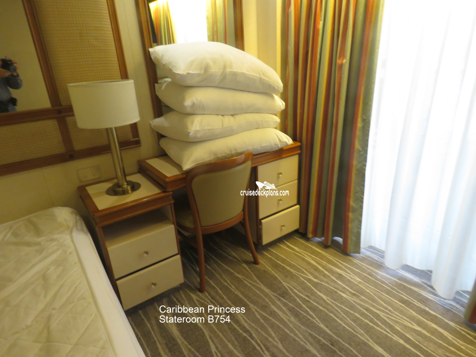 These are some actual stateroom pictures of cabin B754 on the Caribbean Princess. Click on images below for larger image and slide show. The slide show will show the date the picture was uploaded to out website. This date is useful because Caribbean Princess typically will update its cabins every three to five years with new carpeting and decor. We will keep older pictures for you to compare the more recent photos to. The pictures are sorted by the newest ones first. Most of our cabin pictures are contributed by actual cruisers. We pay 50 cents for any that we use. You can upload your cabin photos HERE. Afer you are done looking at these photos and/or the videos below you can click here to select another cabin.