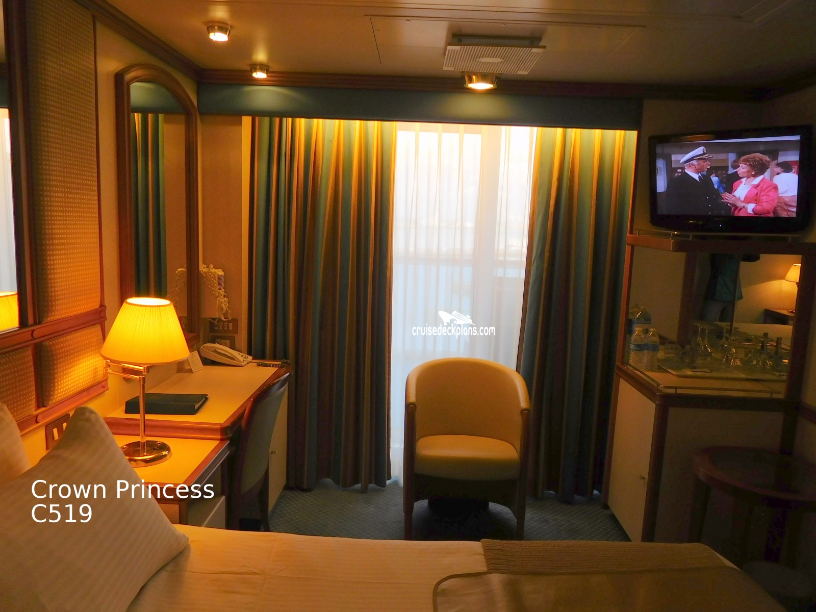 Crown Princess Balcony cabin number C519 ACTUAL videos and/or pictures, floor plans, diagrams and detailed features including a deck image of the actual location on the Crown Princess ship for cabin C519. Cruisedeckplans.com has 73,095 different (staterooms) cabins that have actual cabin pictures and/or cabin videos taken by real cruisers. That is plenty of coverage to provide you with a good sampling of all the different cabins on cruise ships. Take a minute and notice the breadcrumb menu above. This is a quick easy way to navigate our website. You can also use the menu above for menu items specific to the Crown Princess cruise ship.