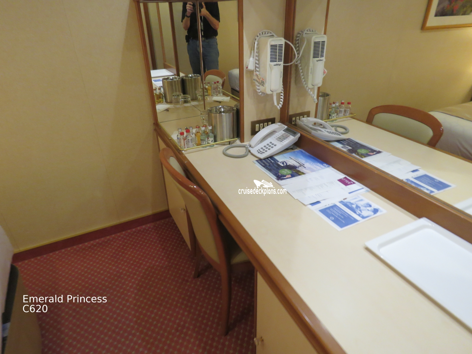 These are some actual stateroom pictures of cabin C620 on the Emerald Princess. Click on images below for larger image and slide show. The slide show will show the date the picture was uploaded to out website. This date is useful because Emerald Princess typically will update its cabins every three to five years with new carpeting and decor. We will keep older pictures for you to compare the more recent photos to. The pictures are sorted by the newest ones first. Most of our cabin pictures are contributed by actual cruisers. We pay 50 cents for any that we use. You can upload your cabin photos HERE. Afer you are done looking at these photos and/or the videos below you can click here to select another cabin.