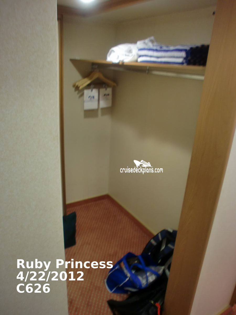 These are some actual stateroom pictures of cabin C626 on the Ruby Princess. Click on images below for larger image and slide show. The slide show will show the date the picture was uploaded to out website. This date is useful because Ruby Princess typically will update its cabins every three to five years with new carpeting and decor. We will keep older pictures for you to compare the more recent photos to. The pictures are sorted by the newest ones first. Most of our cabin pictures are contributed by actual cruisers. We pay 50 cents for any that we use. You can upload your cabin photos HERE. Afer you are done looking at these photos and/or the videos below you can click here to select another cabin.