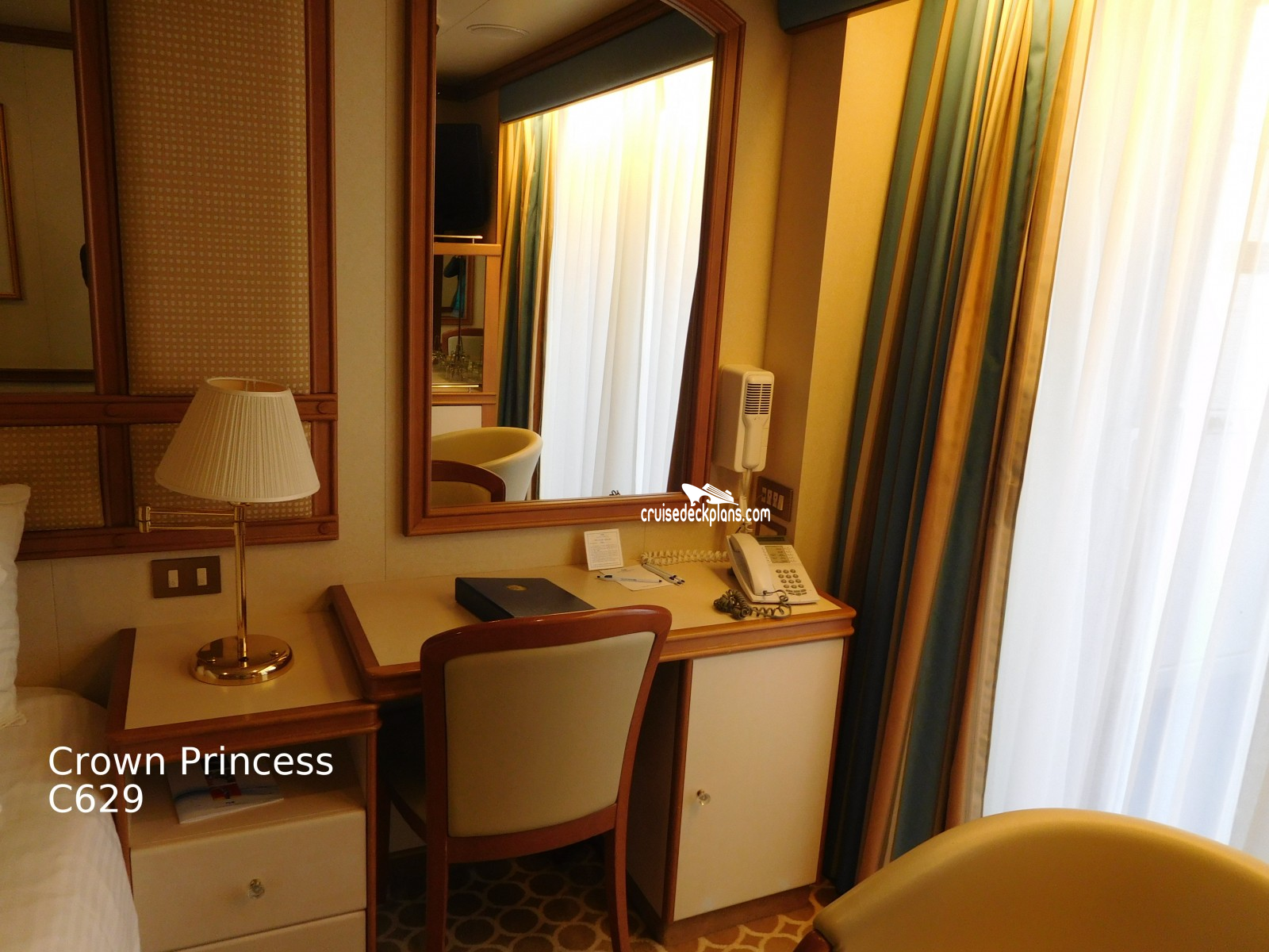 Crown Princess Balcony cabin number C629 ACTUAL videos and/or pictures, floor plans, diagrams and detailed features including a deck image of the actual location on the Crown Princess ship for cabin C629. Cruisedeckplans.com has 72,970 different (staterooms) cabins that have actual cabin pictures and/or cabin videos taken by real cruisers. That is plenty of coverage to provide you with a good sampling of all the different cabins on cruise ships. Take a minute and notice the breadcrumb menu above. This is a quick easy way to navigate our website. You can also use the menu above for menu items specific to the Crown Princess cruise ship.