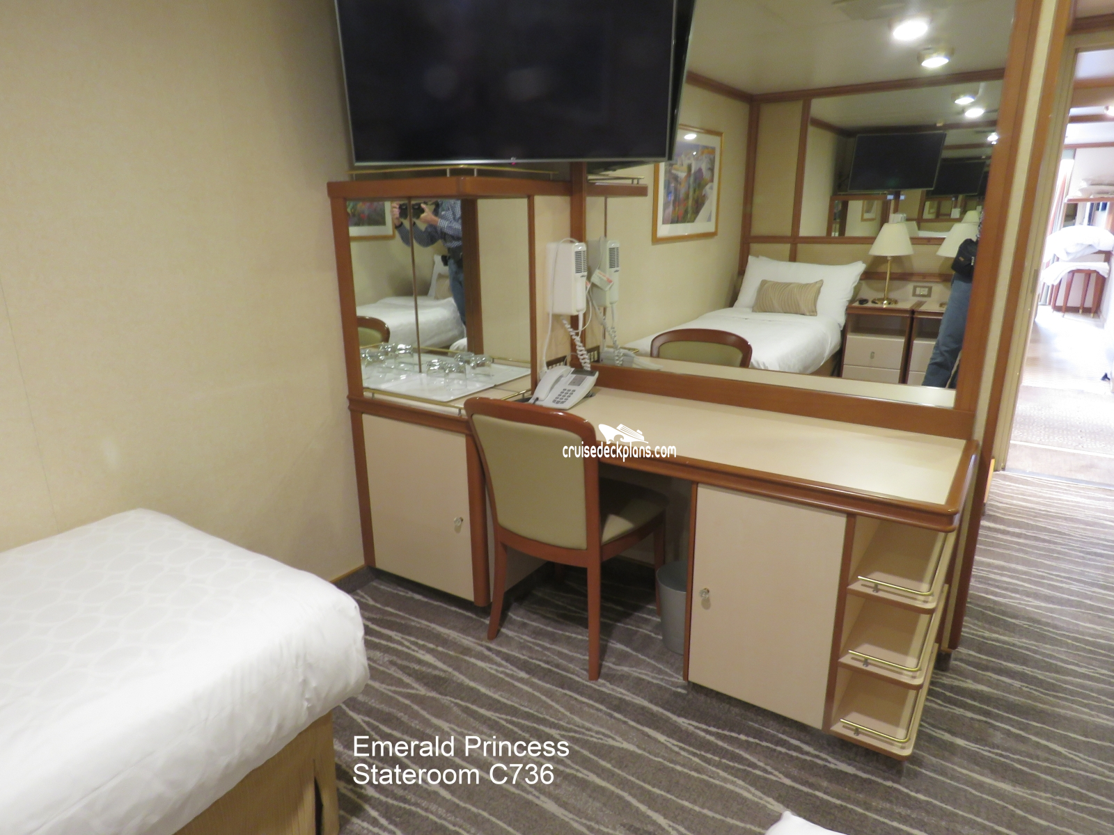 Emerald Princess Interior cabin number C736 ACTUAL videos and/or pictures, floor plans, diagrams and detailed features including a deck image of the actual location on the Emerald Princess ship for cabin C736. Cruisedeckplans.com has 75,311 different (staterooms) cabins that have actual cabin pictures and/or cabin videos taken by real cruisers. That is plenty of coverage to provide you with a good sampling of all the different cabins on cruise ships. Take a minute and notice the breadcrumb menu above. This is a quick easy way to navigate our website. You can also use the menu above for menu items specific to the Emerald Princess cruise ship.