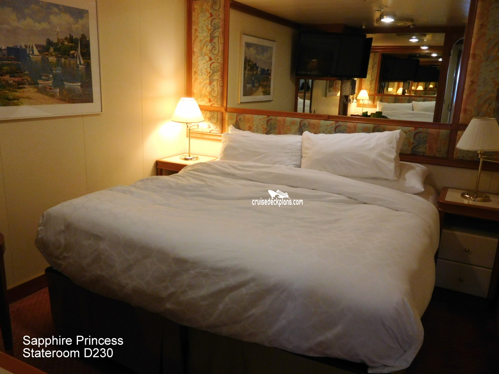 These are some actual stateroom pictures of cabin D230 on the Sapphire Princess. Click on images below for larger image and slide show. The slide show will show the date the picture was uploaded to out website. This date is useful because Sapphire Princess typically will update its cabins every three to five years with new carpeting and decor. We will keep older pictures for you to compare the more recent photos to. The pictures are sorted by the newest ones first. Most of our cabin pictures are contributed by actual cruisers. We pay 50 cents for any that we use. You can upload your cabin photos HERE. Afer you are done looking at these photos and/or the videos below you can click here to select another cabin.