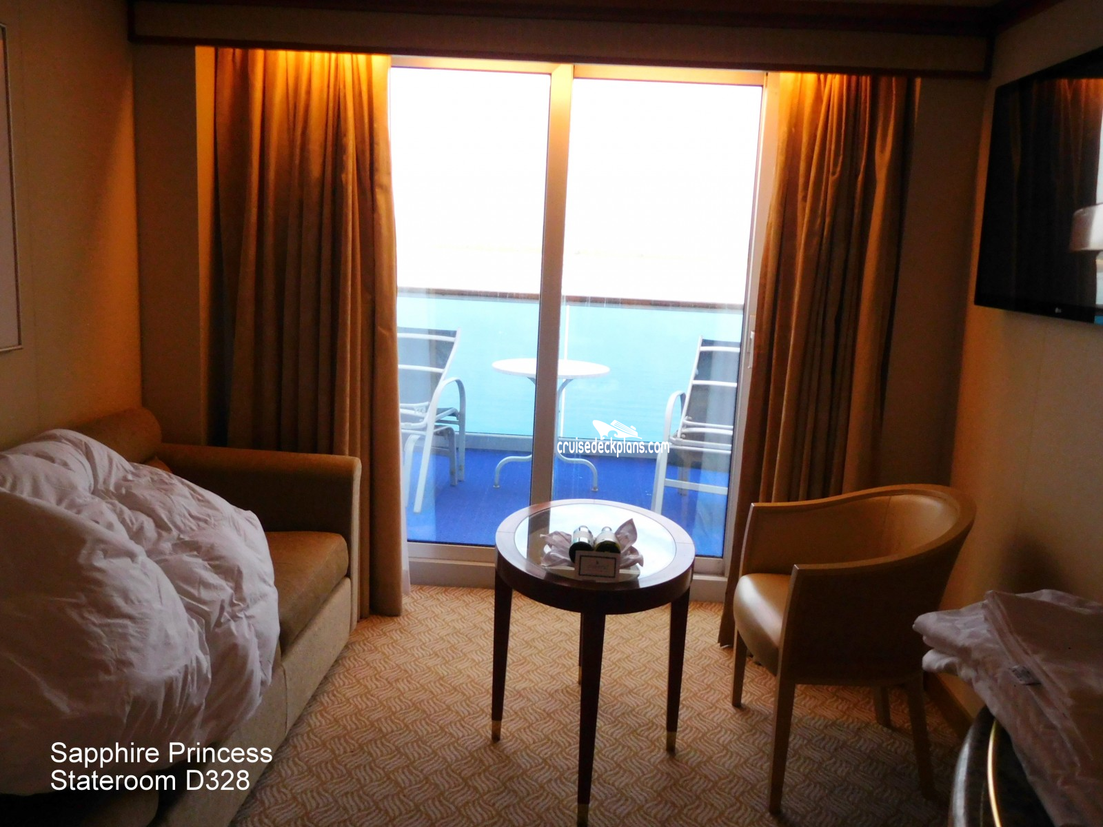 These are some actual stateroom pictures of cabin D328 on the Sapphire Princess. Click on images below for larger image and slide show. The slide show will show the date the picture was uploaded to out website. This date is useful because Sapphire Princess typically will update its cabins every three to five years with new carpeting and decor. We will keep older pictures for you to compare the more recent photos to. The pictures are sorted by the newest ones first. Most of our cabin pictures are contributed by actual cruisers. We pay 50 cents for any that we use. You can upload your cabin photos HERE. Afer you are done looking at these photos and/or the videos below you can click here to select another cabin.