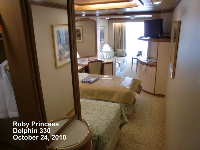 These are some actual stateroom pictures of cabin D330 on the Ruby Princess. Click on images below for larger image and slide show. The slide show will show the date the picture was uploaded to out website. This date is useful because Ruby Princess typically will update its cabins every three to five years with new carpeting and decor. We will keep older pictures for you to compare the more recent photos to. The pictures are sorted by the newest ones first. Most of our cabin pictures are contributed by actual cruisers. We pay 50 cents for any that we use. You can upload your cabin photos HERE. Afer you are done looking at these photos and/or the videos below you can click here to select another cabin.