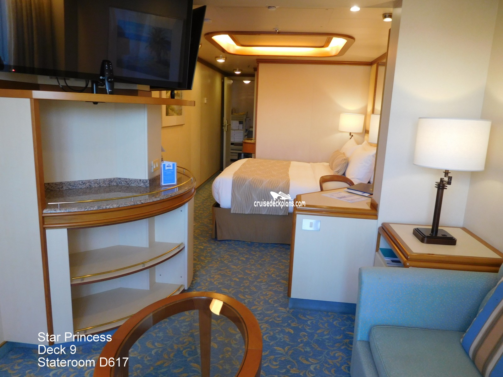 Star Princess II Mini-Suite cabin number D617 ACTUAL videos and/or pictures, floor plans, diagrams and detailed features including a deck image of the actual location on the Star Princess II ship for cabin D617. Cruisedeckplans.com has 73,093 different (staterooms) cabins that have actual cabin pictures and/or cabin videos taken by real cruisers. That is plenty of coverage to provide you with a good sampling of all the different cabins on cruise ships. Take a minute and notice the breadcrumb menu above. This is a quick easy way to navigate our website. You can also use the menu above for menu items specific to the Star Princess II cruise ship.