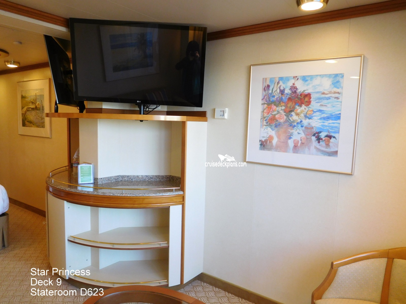 These are some actual stateroom pictures of cabin D623 on the Star Princess II. Click on images below for larger image and slide show. The slide show will show the date the picture was uploaded to out website. This date is useful because Star Princess II typically will update its cabins every three to five years with new carpeting and decor. We will keep older pictures for you to compare the more recent photos to. The pictures are sorted by the newest ones first. Most of our cabin pictures are contributed by actual cruisers. We pay 50 cents for any that we use. You can upload your cabin photos HERE. Afer you are done looking at these photos and/or the videos below you can click here to select another cabin.