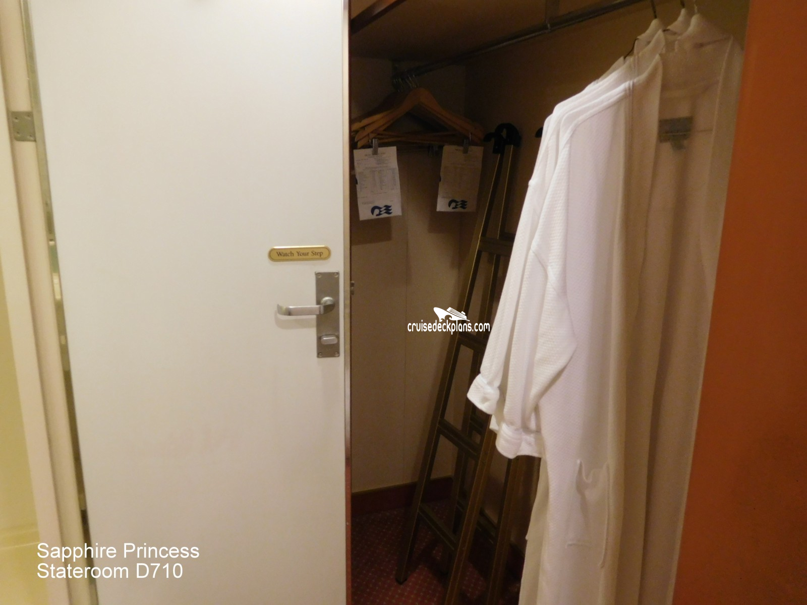 These are some actual stateroom pictures of cabin D710 on the Sapphire Princess. Click on images below for larger image and slide show. The slide show will show the date the picture was uploaded to out website. This date is useful because Sapphire Princess typically will update its cabins every three to five years with new carpeting and decor. We will keep older pictures for you to compare the more recent photos to. The pictures are sorted by the newest ones first. Most of our cabin pictures are contributed by actual cruisers. We pay 50 cents for any that we use. You can upload your cabin photos HERE. Afer you are done looking at these photos and/or the videos below you can click here to select another cabin.