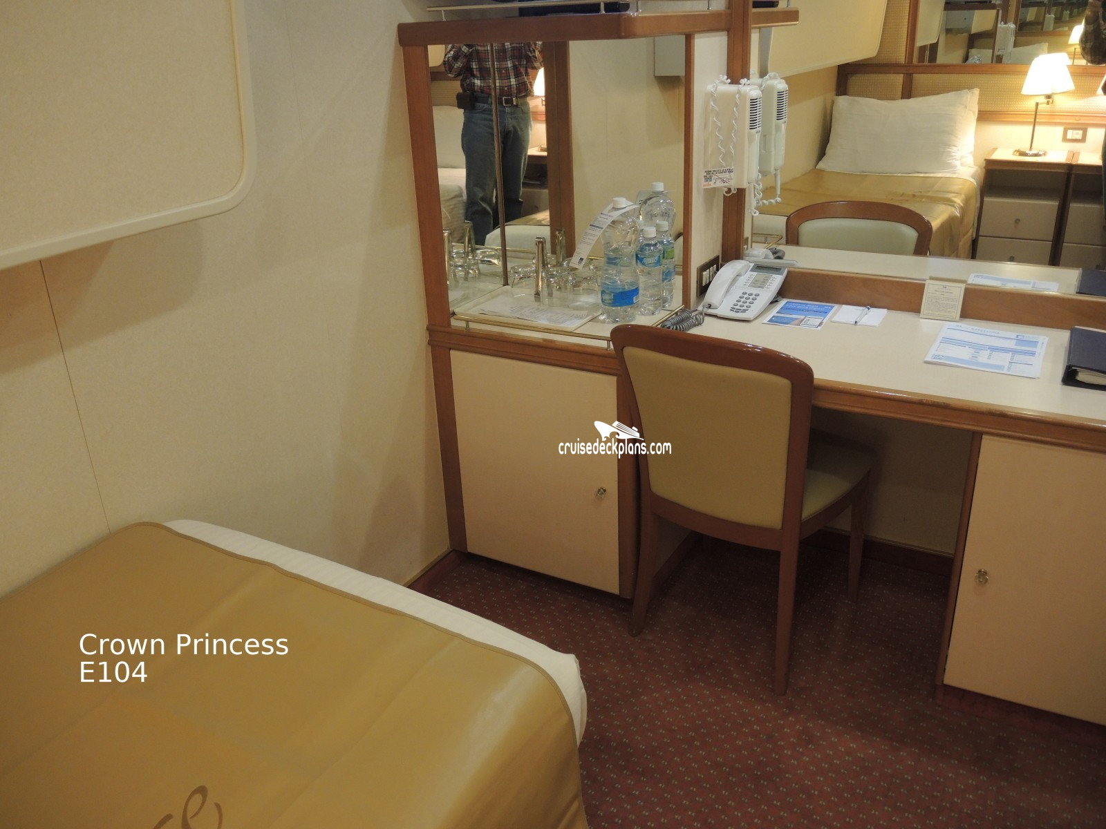 Crown Princess Interior cabin number E104 ACTUAL videos and/or pictures, floor plans, diagrams and detailed features including a deck image of the actual location on the Crown Princess ship for cabin E104. Cruisedeckplans.com has 74,954 different (staterooms) cabins that have actual cabin pictures and/or cabin videos taken by real cruisers. That is plenty of coverage to provide you with a good sampling of all the different cabins on cruise ships. Take a minute and notice the breadcrumb menu above. This is a quick easy way to navigate our website. You can also use the menu above for menu items specific to the Crown Princess cruise ship.