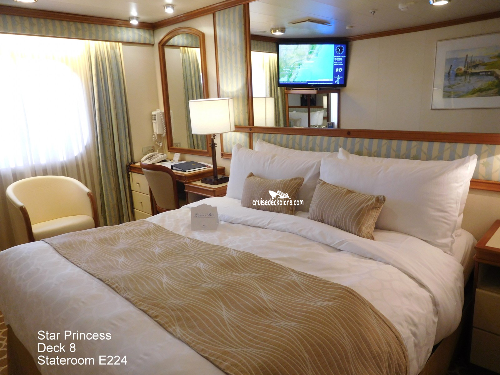 These are some actual stateroom pictures of cabin E224 on the Star Princess II. Click on images below for larger image and slide show. The slide show will show the date the picture was uploaded to out website. This date is useful because Star Princess II typically will update its cabins every three to five years with new carpeting and decor. We will keep older pictures for you to compare the more recent photos to. The pictures are sorted by the newest ones first. Most of our cabin pictures are contributed by actual cruisers. We pay 50 cents for any that we use. You can upload your cabin photos HERE. Afer you are done looking at these photos and/or the videos below you can click here to select another cabin.