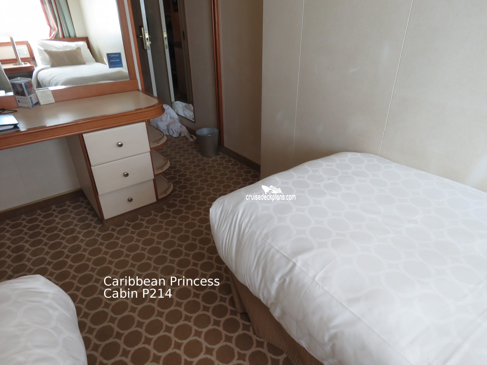 These are some actual stateroom pictures of cabin P214 on the Caribbean Princess. Click on images below for larger image and slide show. The slide show will show the date the picture was uploaded to out website. This date is useful because Caribbean Princess typically will update its cabins every three to five years with new carpeting and decor. We will keep older pictures for you to compare the more recent photos to. The pictures are sorted by the newest ones first. Most of our cabin pictures are contributed by actual cruisers. We pay 50 cents for any that we use. You can upload your cabin photos HERE. Afer you are done looking at these photos and/or the videos below you can click here to select another cabin.