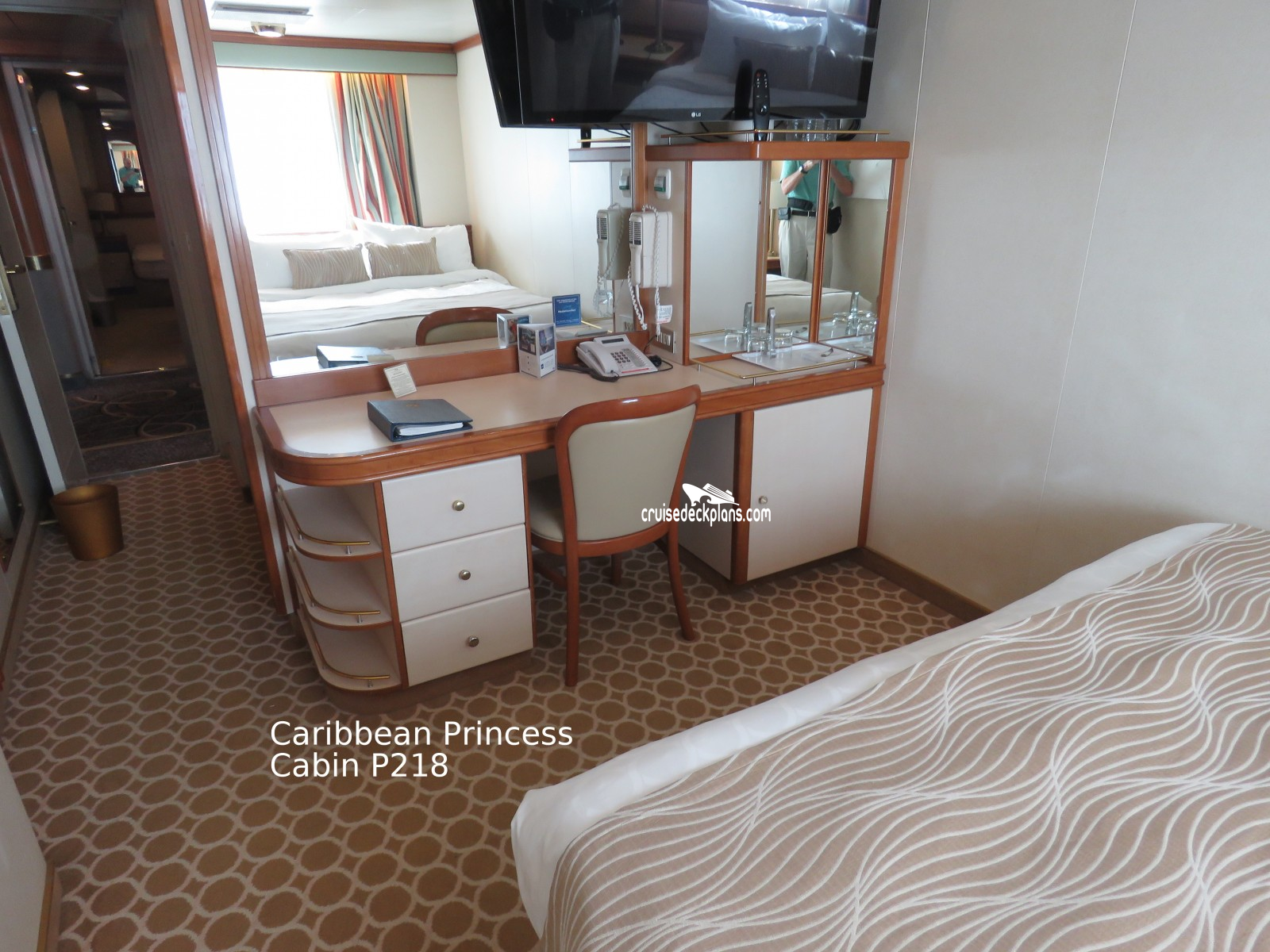 These are some actual stateroom pictures of cabin P218 on the Caribbean Princess. Click on images below for larger image and slide show. The slide show will show the date the picture was uploaded to out website. This date is useful because Caribbean Princess typically will update its cabins every three to five years with new carpeting and decor. We will keep older pictures for you to compare the more recent photos to. The pictures are sorted by the newest ones first. Most of our cabin pictures are contributed by actual cruisers. We pay 50 cents for any that we use. You can upload your cabin photos HERE. Afer you are done looking at these photos and/or the videos below you can click here to select another cabin.